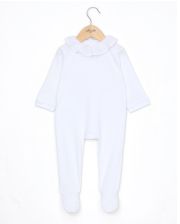Pyjama bébé en côtes 1x1 coton. Col volanté en popeline et bord en dentelle. Boutons pression au dos.