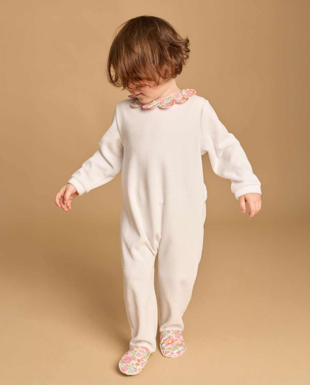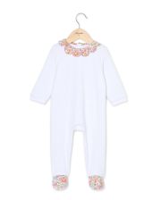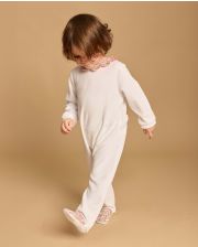 Pyjama bébé en velours éponge. Petit col pétale en coton. Ouverture dos pont pressionné.