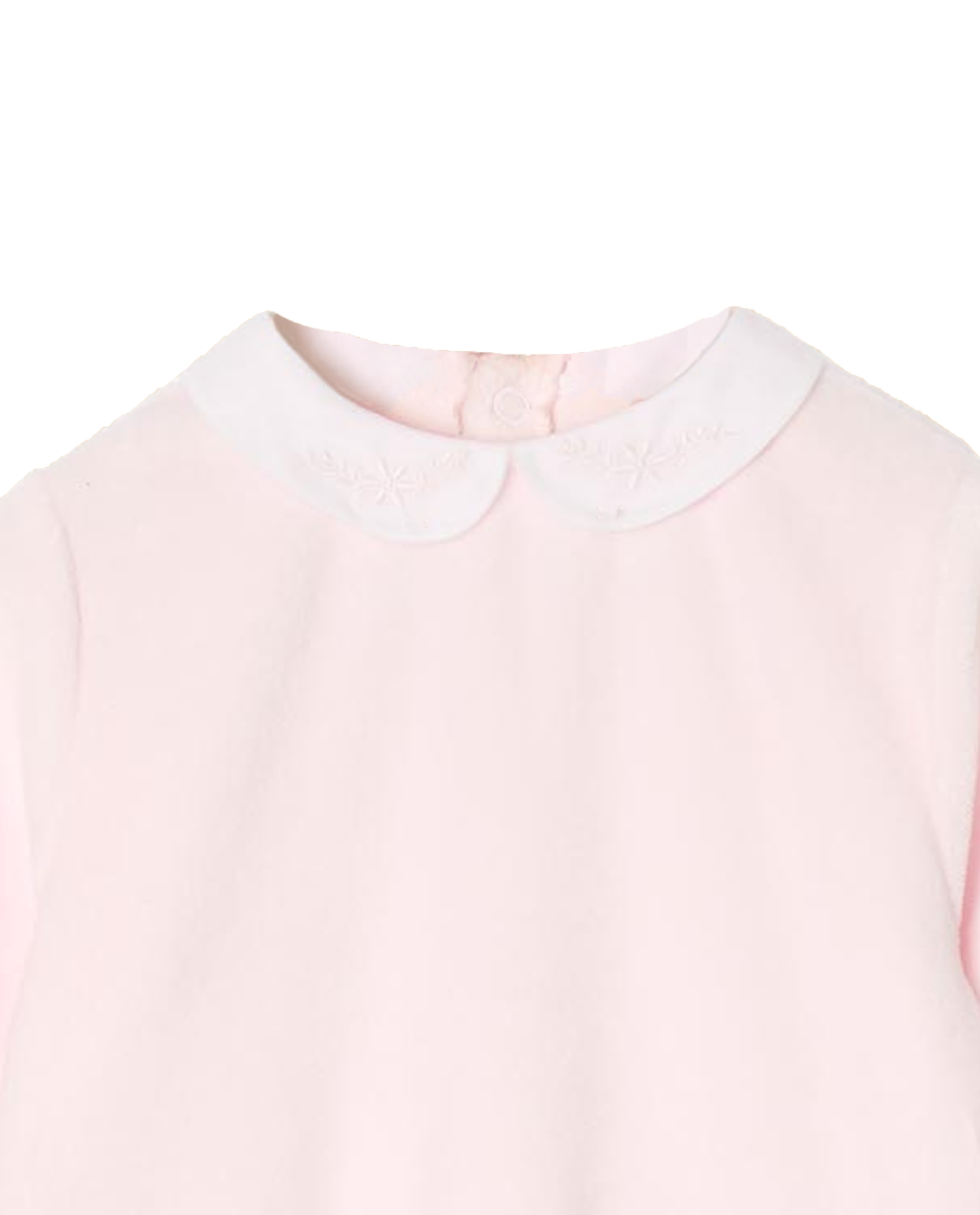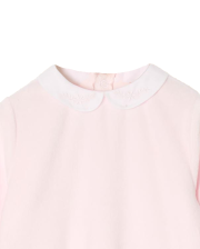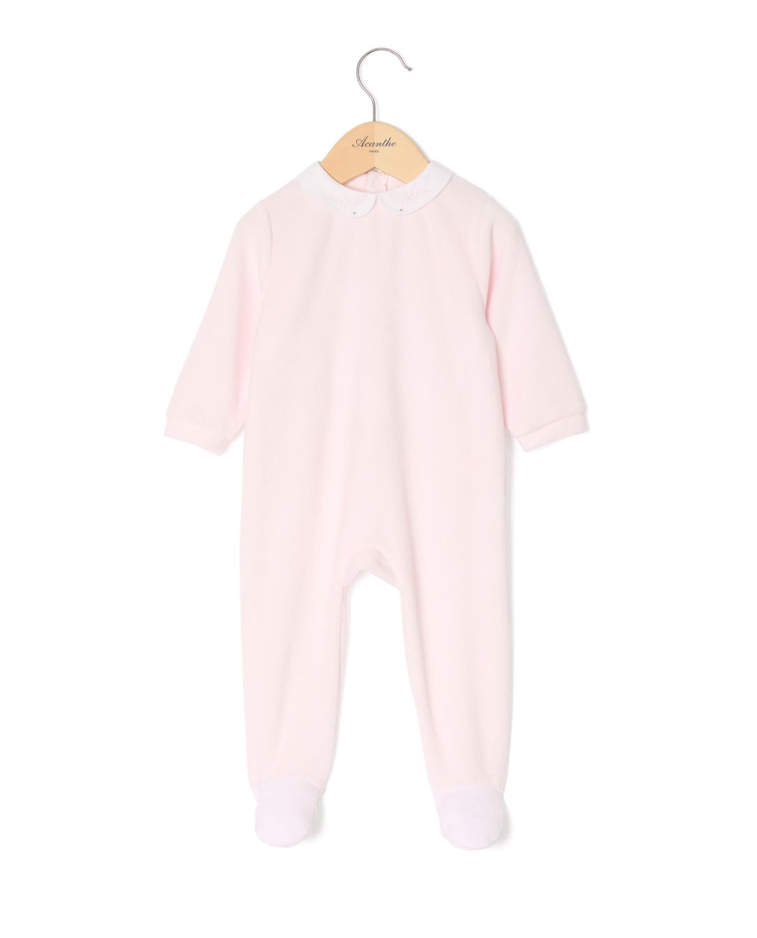 Pyjama bébé en velours éponge rose, col rond brodé et ouverture dos pont pressionné.