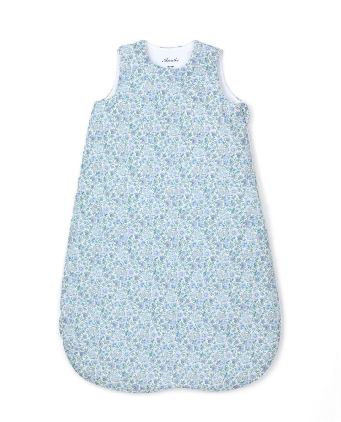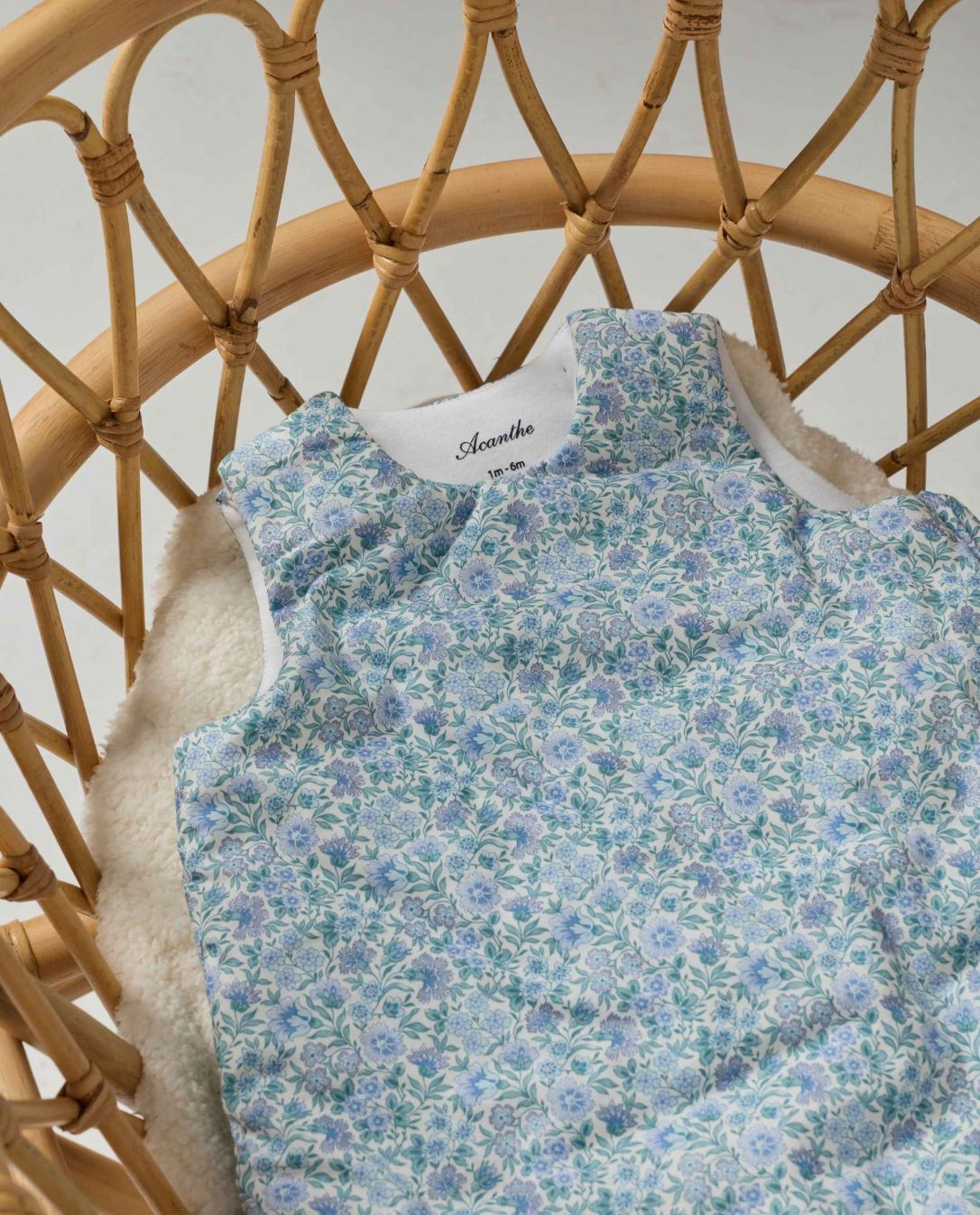 Gigoteuse ouatinée sans manches. Tissu Liberty Carnation Garden. Pressions aux épaules. Ouverture zippée sur le côté gauche. Indice de chaleur TOG 2.5