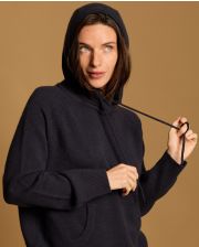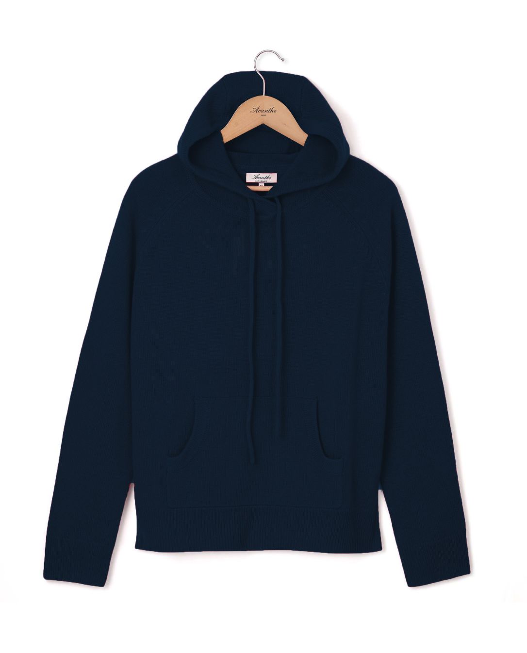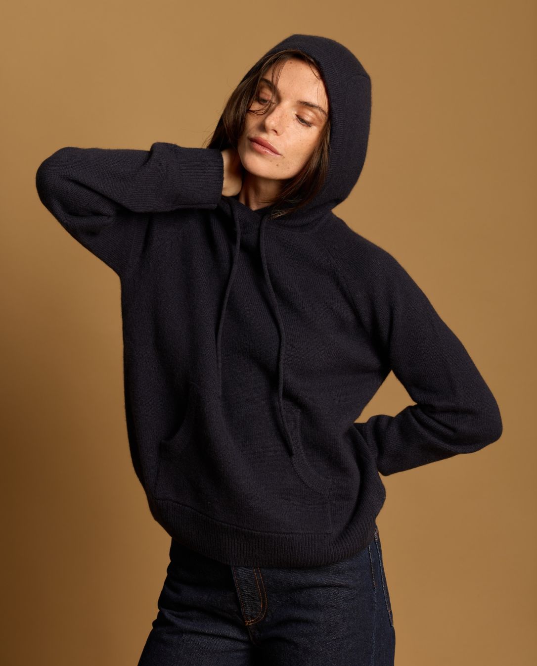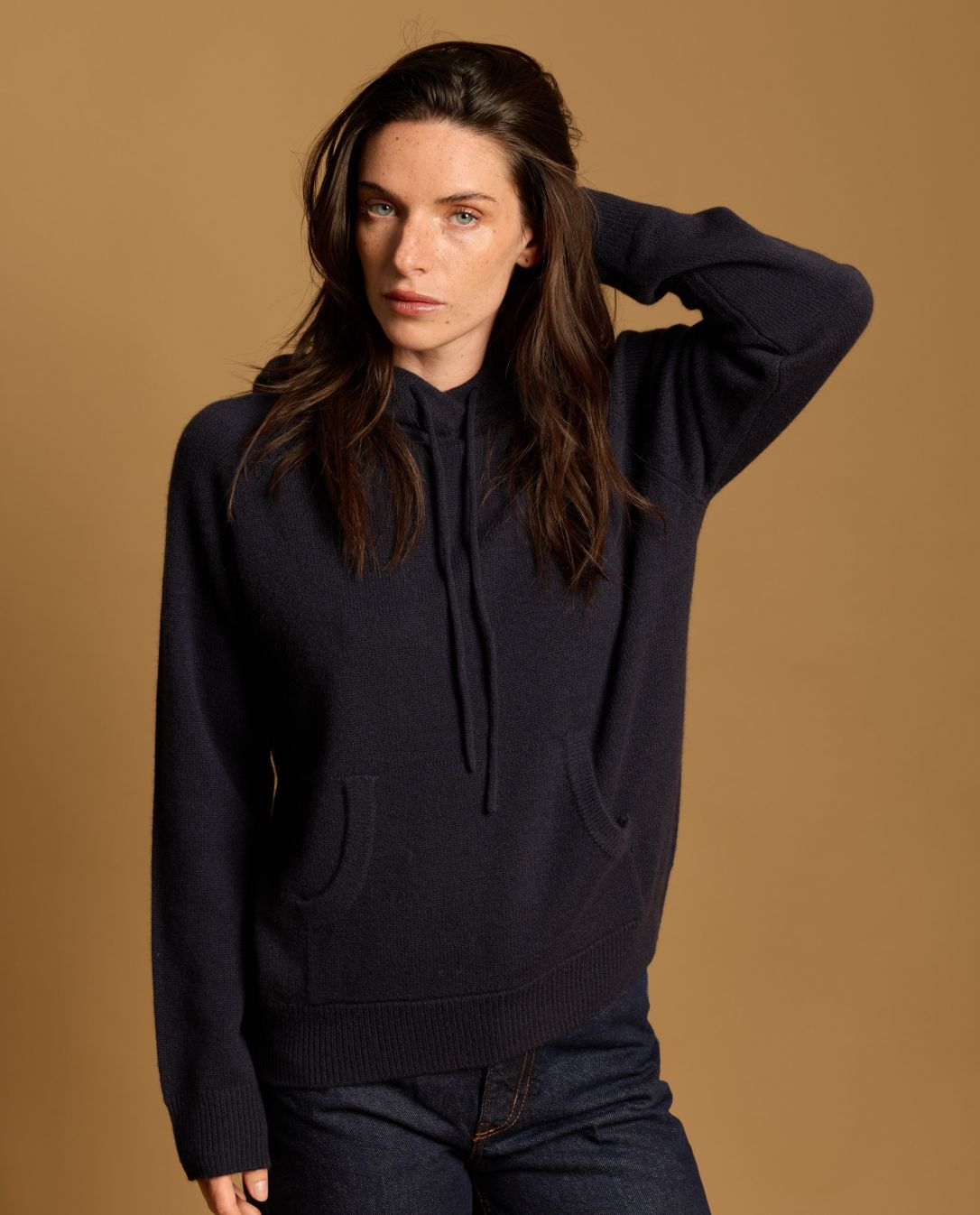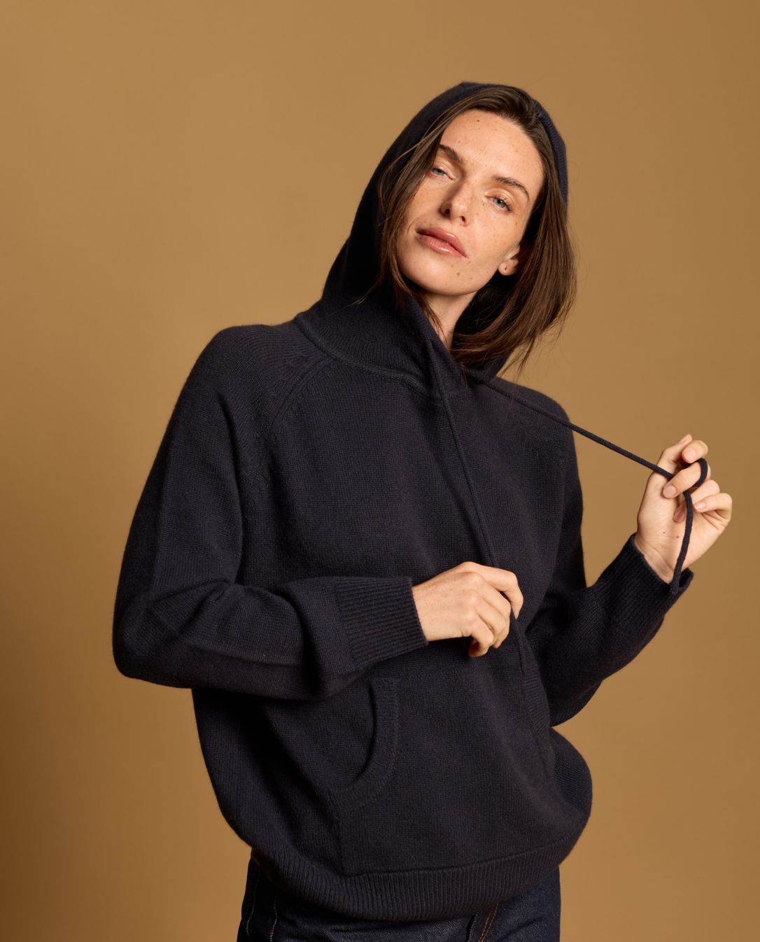 Pull à capuche en cachemire double fil. Poche au devant. Finition bord côtes. Taille unique. Longueur épaule 61 cm. Le mannequin mesure 1,77m.