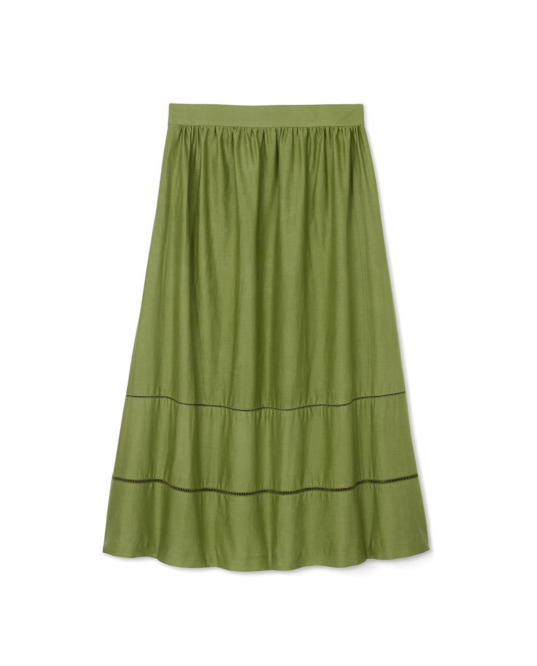 Jupe midi avec galons. Popeline coton uni. Zip côté. Longueur 83 cm toutes tailles. Le mannequin mesure 1,77m et porte une taille 1.