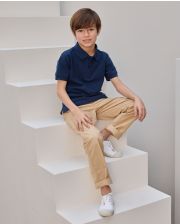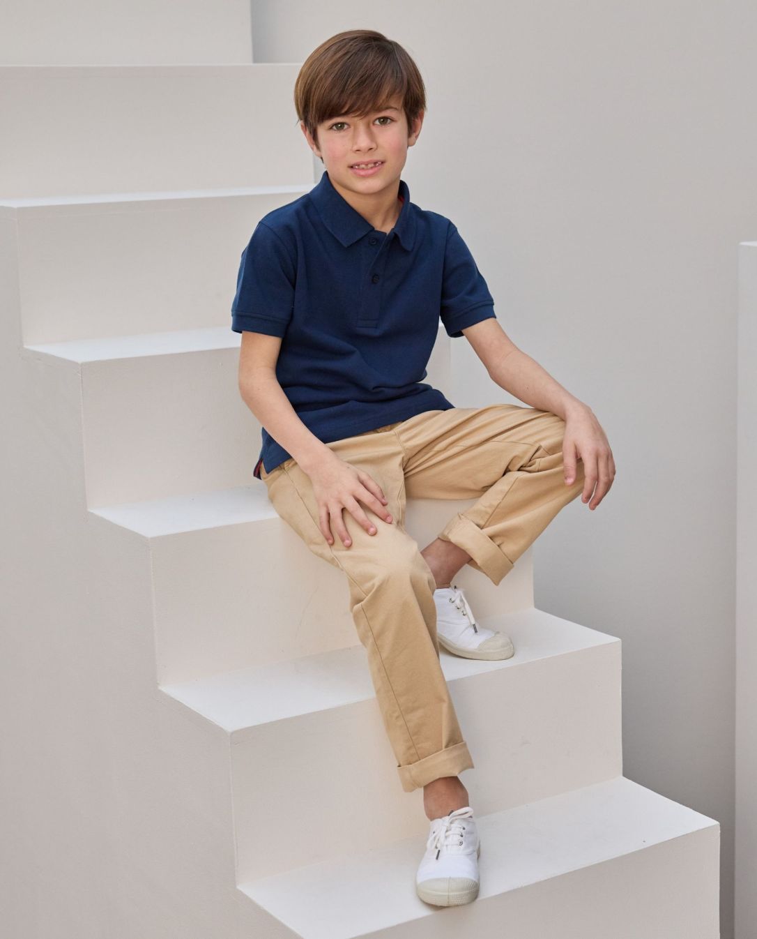 Polo garçon en maille piquée. Manches courtes. Col polo en côtes. Empiècement à l'intérieur sous l'encolure en popeline rayée. Fentes aux côtés.100% coton.