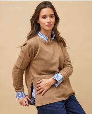 Large pull encolure ronde. Fente zippée de chaque côté. Finition bord-côtes. 100% cachemire.
