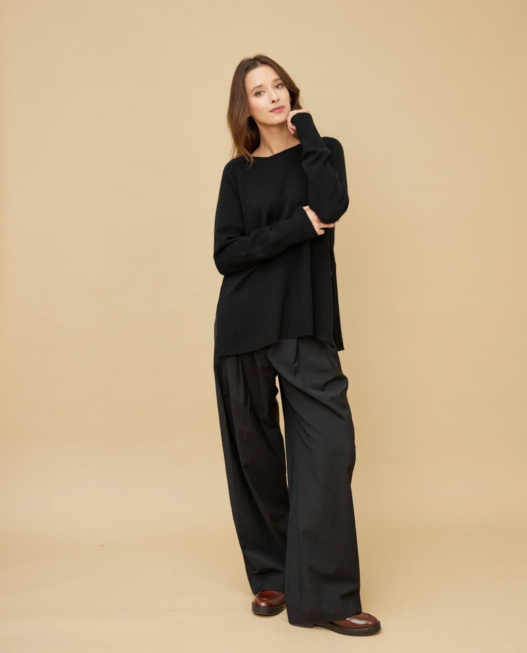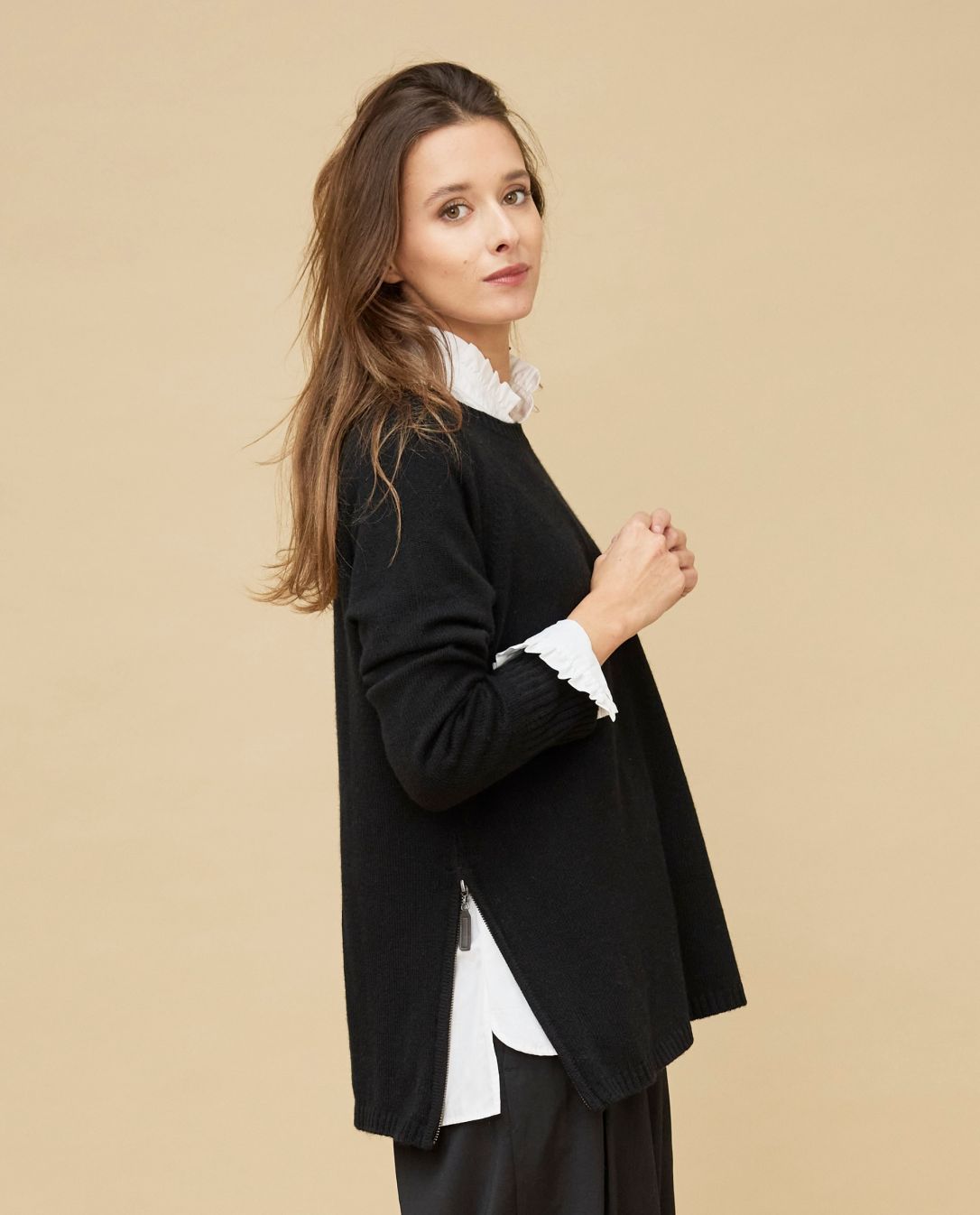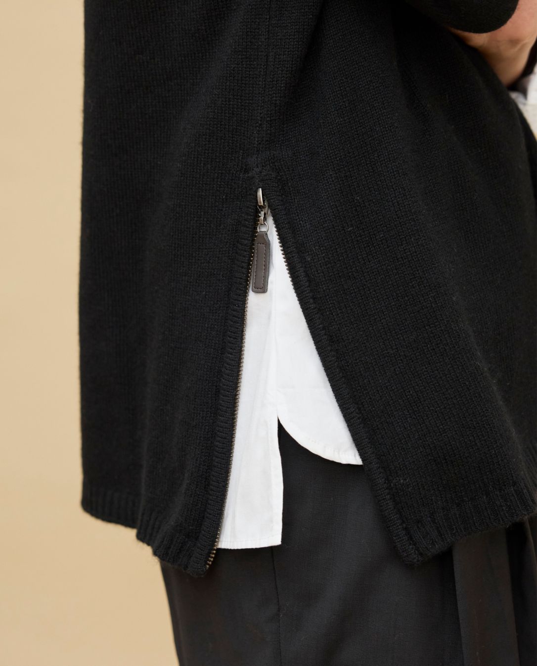 Large pull encolure ronde. Fente zippée de chaque côté. Finition bord-côtes. 100% cachemire.