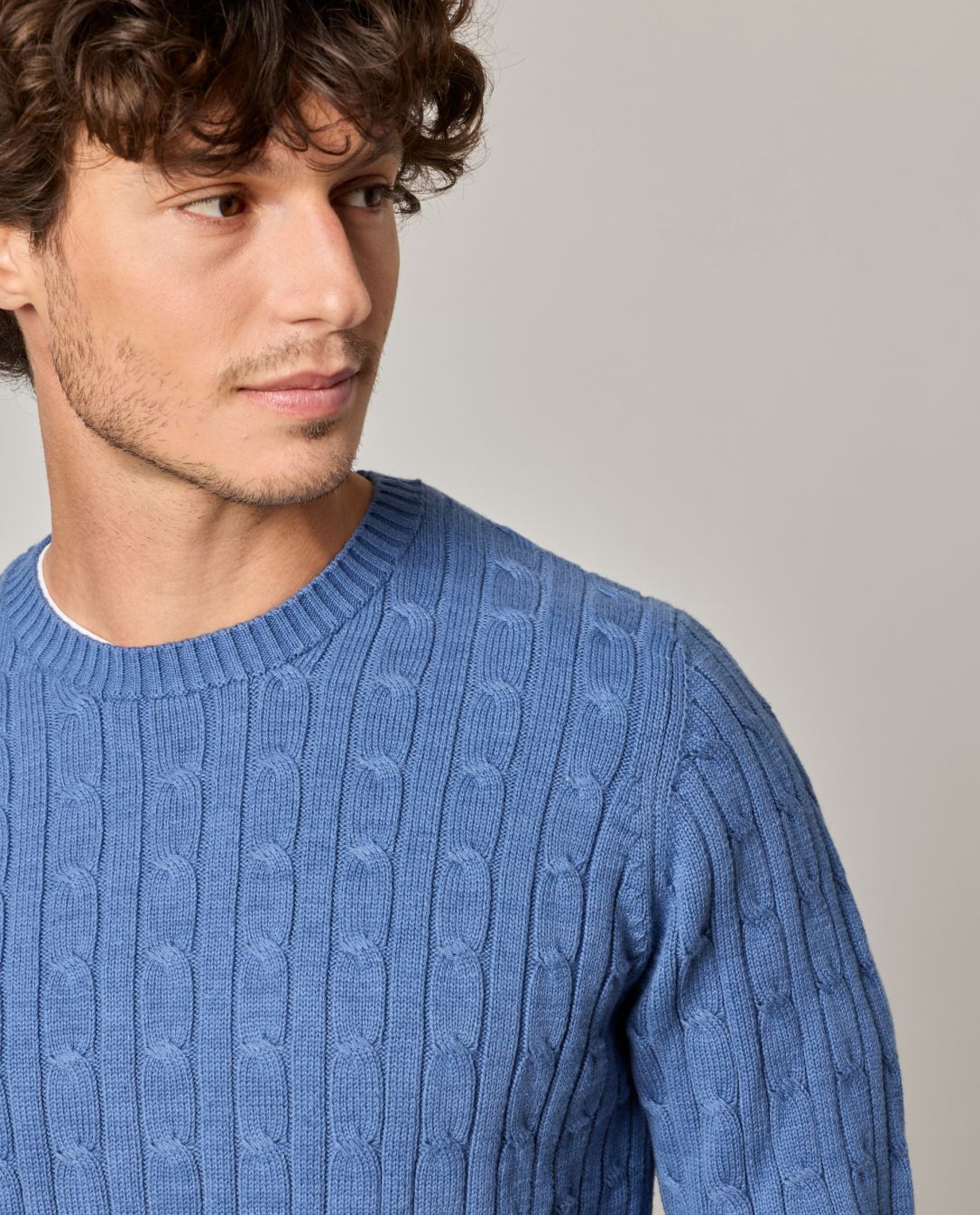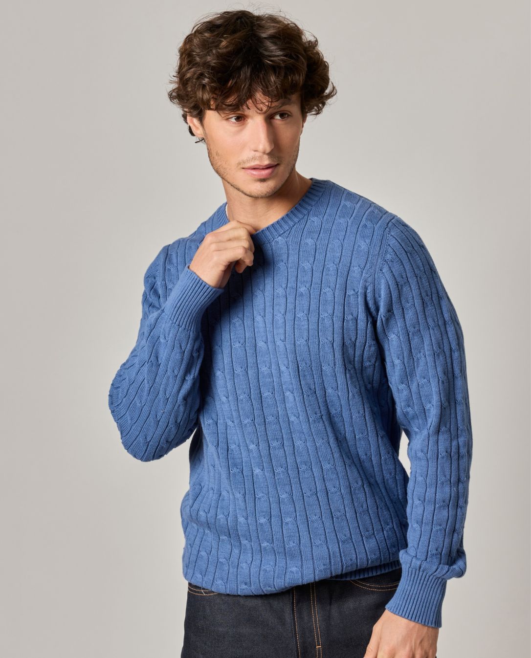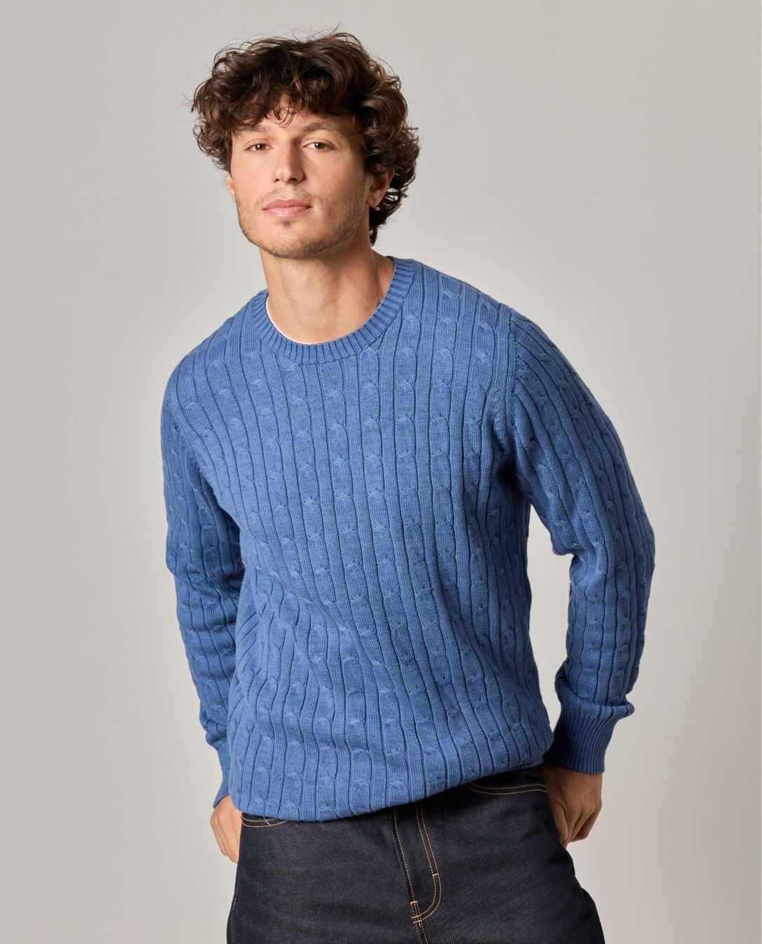 Pull torsades coton. Encolure ronde. Torsades devant et dos. Finitions bord côtes. Le mannequin mesure 1,83m et porte une taille L.