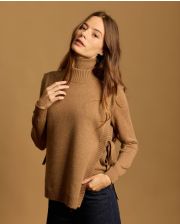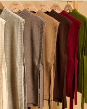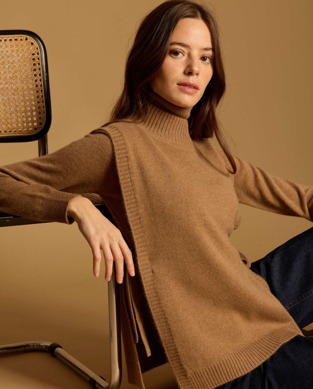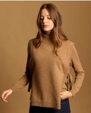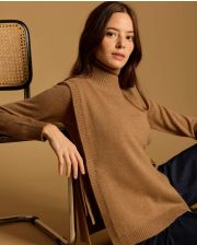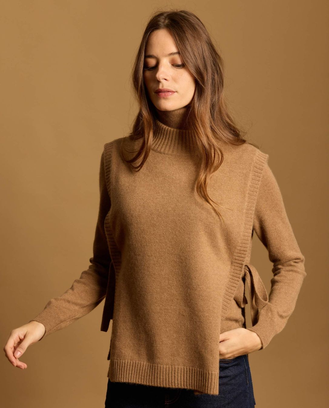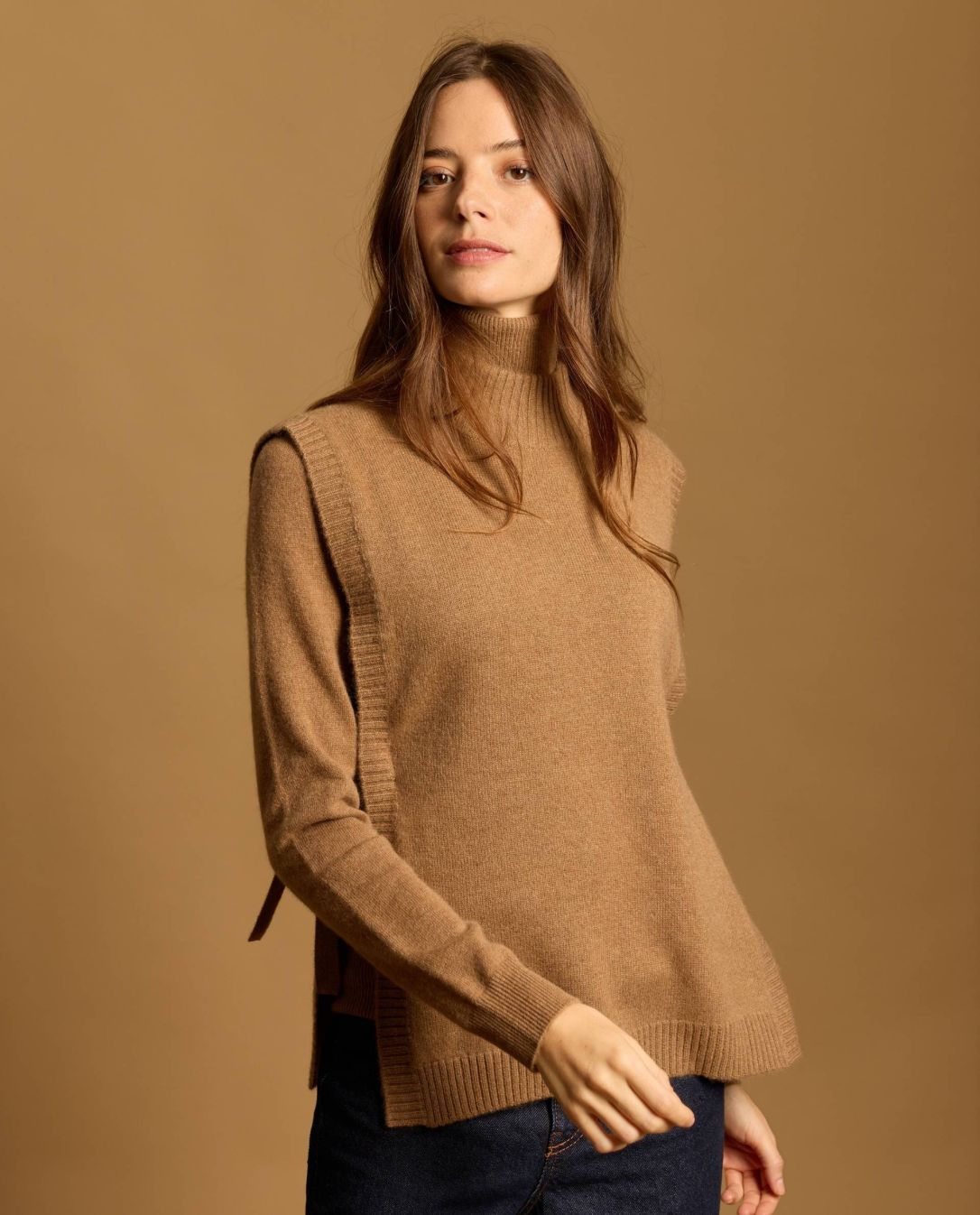 Pull sans manches en cachemire double fil. Col montant. Deux liens de chaque côté. Finition bord côtes. Taille unique. Longueur épaule 60 cm. Le mannequin mesure 1,72m.