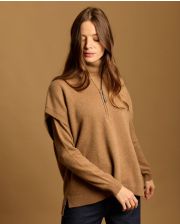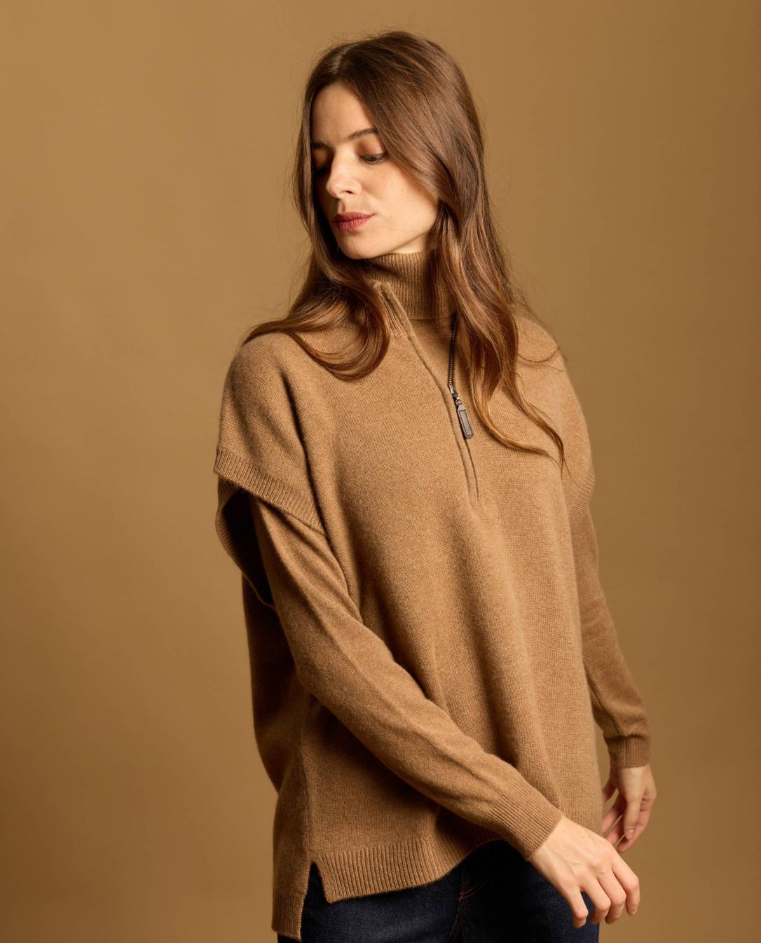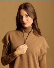 Pull loose asymétrique sans manches en cachemire double fil. Col zippé montant. Taille unique. Longueur épaule dos 66 cm. Le mannequin mesure 1,72m.