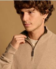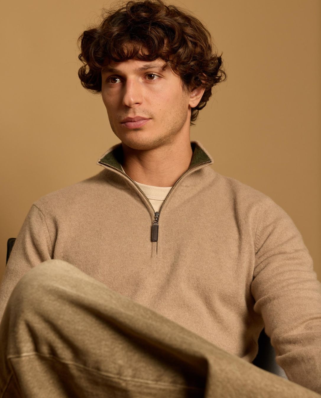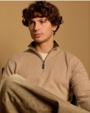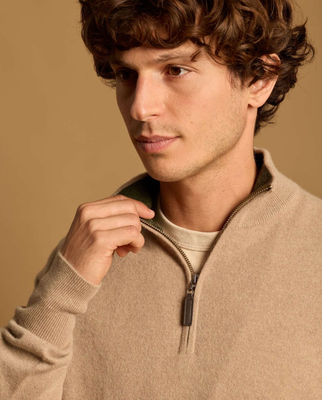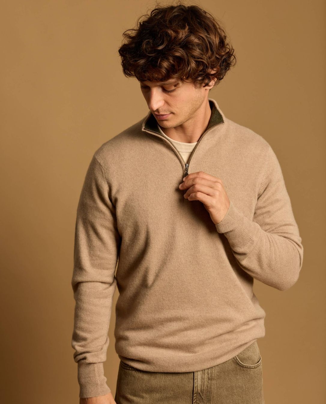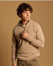 Pull col zippé avec intérieur contrasté, en cachemire double fil. Finition bord côtes.