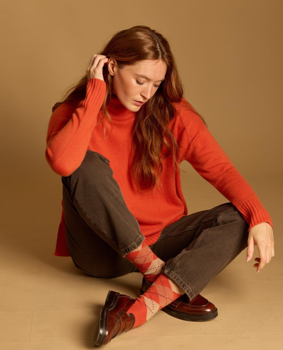 Pull col roulé ample asymétrique en cachemire double fil. Epaules tombantes. Deux fentes côté. Finition bord côtes. Taille unique. Longueur épaule dos 68 cm. Le mannequin mesure 1,78m.