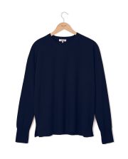 Pull loose encolure ronde en cachemire double fil. Deux fentes côté. Finition bord côtes. Taille unique. Longueur épaule 65 cm. Le mannequin mesure 1,70m.