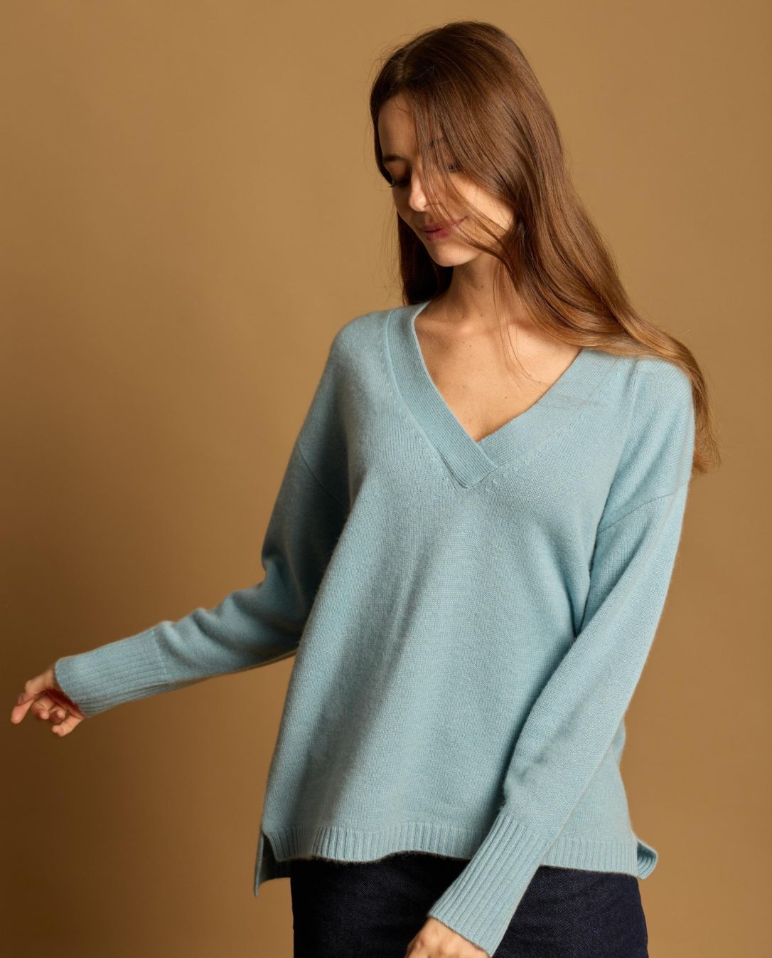 Pull loose asymétrique en cachemire double fil. Encolure large bord, V profond. Taille unique. Longueur épaule 67 cm. Le mannequin mesure 1,78m.