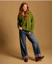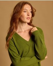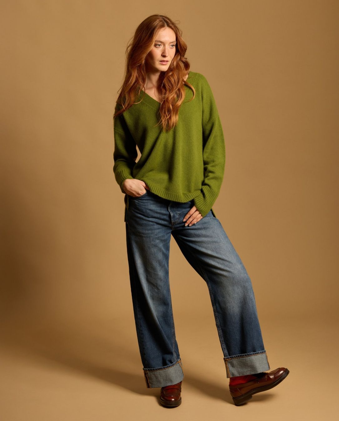 Pull loose asymétrique en cachemire double fil. Encolure large bord, V profond. Taille unique. Longueur épaule 67 cm. Le mannequin mesure 1,78m.