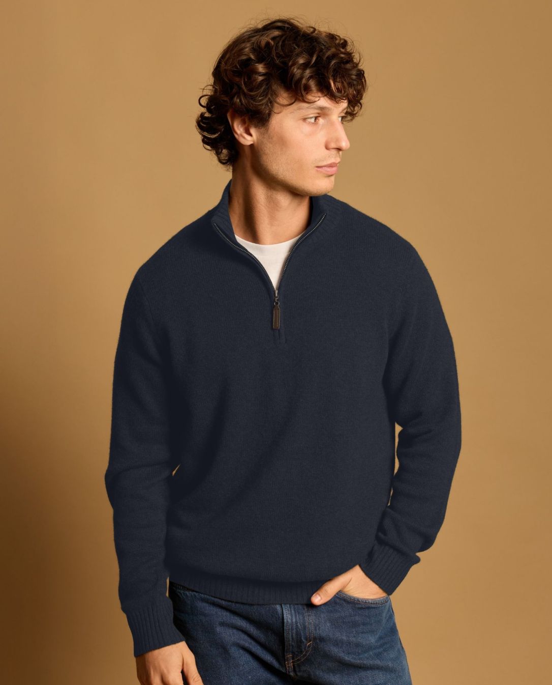 Pull col zippé avec intérieur contrasté, en cachemire double fil. Maille plus épaisse que sur notre pull zippé classique. Finition bord côtes.