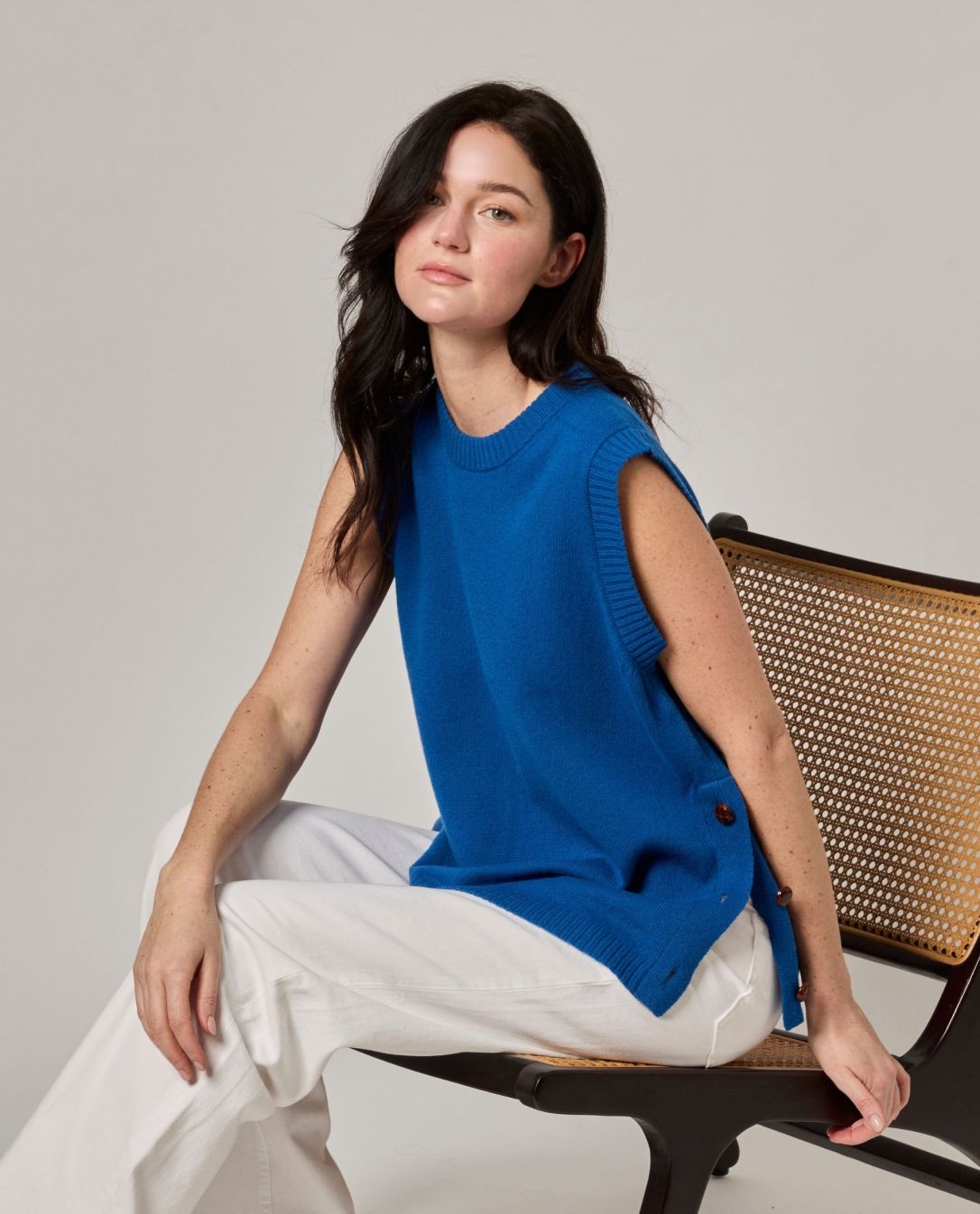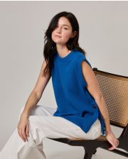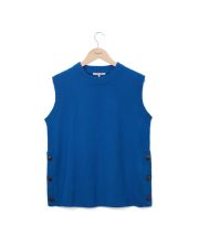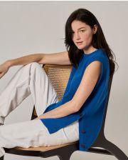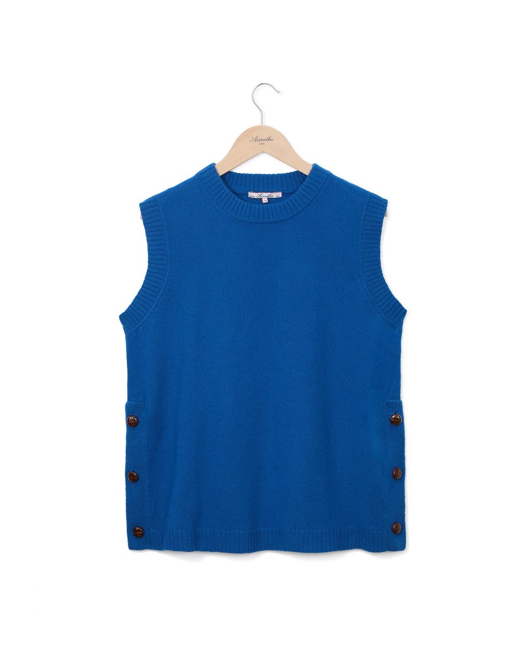 Pull col rond sans manches. Ouvertures boutonnées sur les côtés. Pure laine d'agneau. Taille unique. Longueur totale 62cm. Le mannequin mesure 1,73m et porte une taille unique.