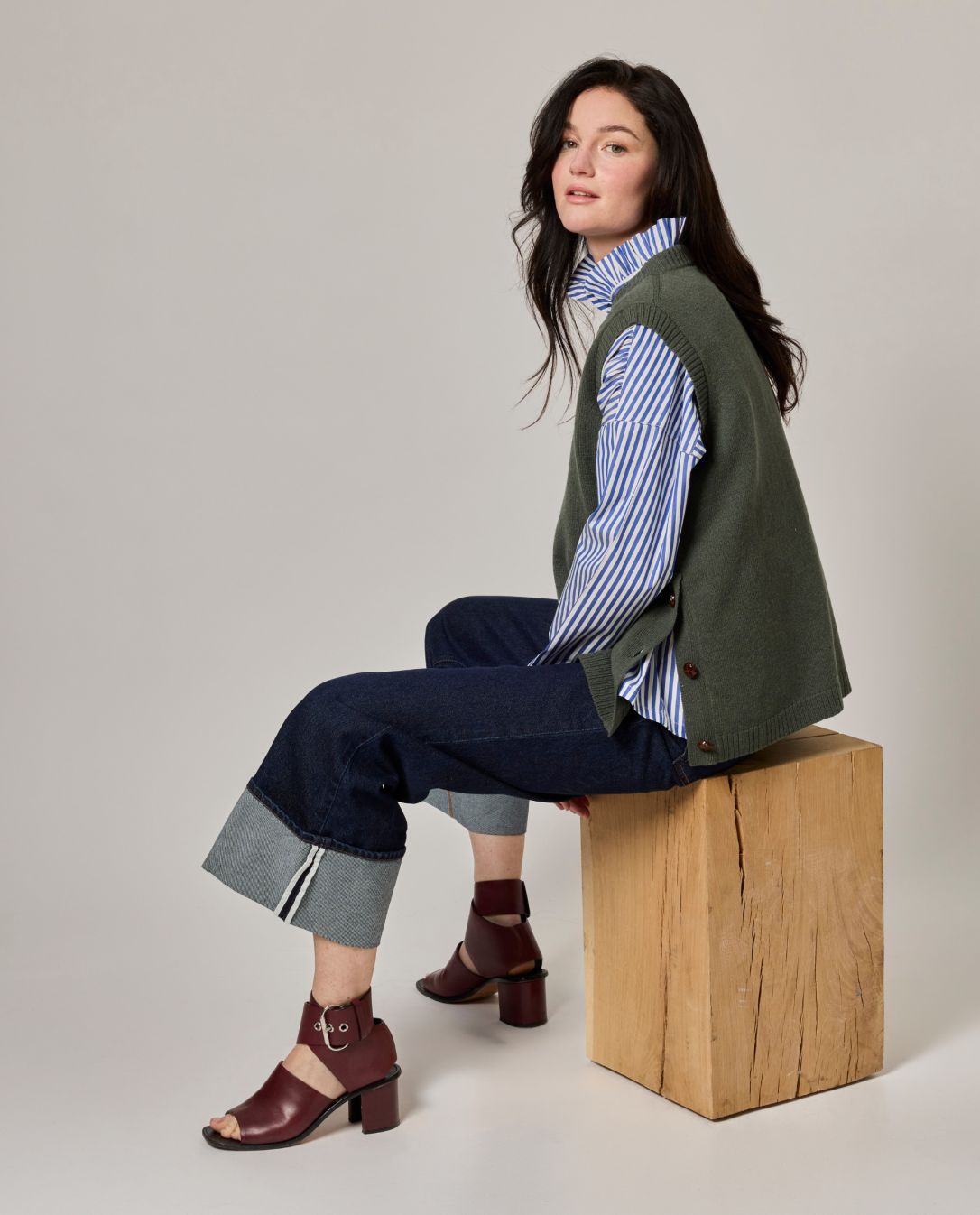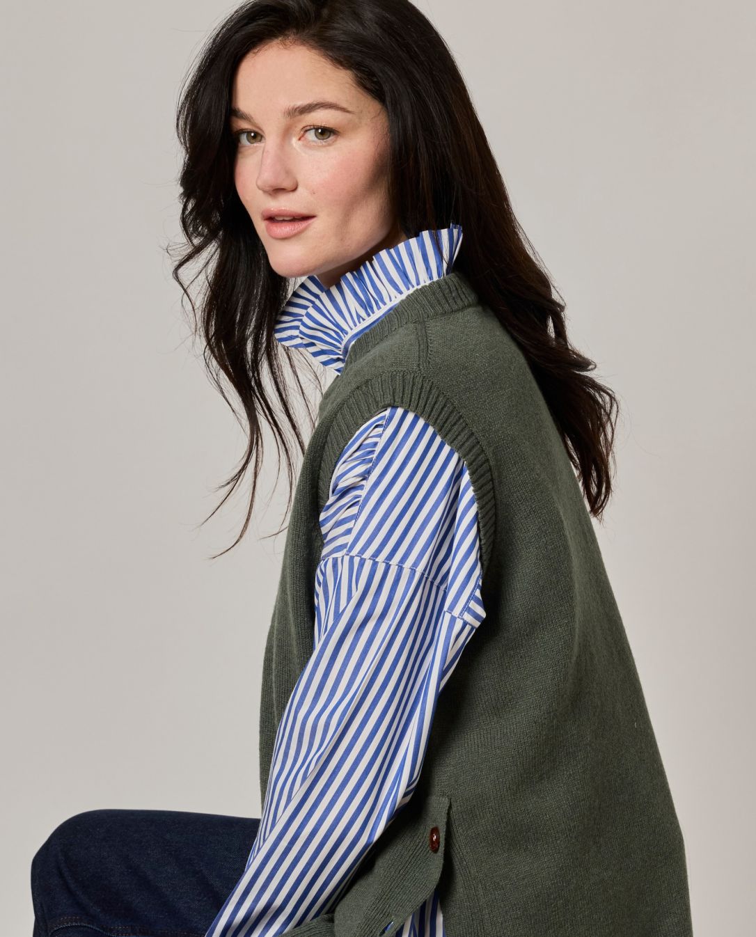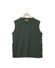 Pull col rond sans manches. Ouvertures boutonnées sur les côtés. Pure laine d'agneau. Taille unique. Longueur totale 62cm. Le mannequin mesure 1,73m et porte une taille unique.
