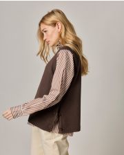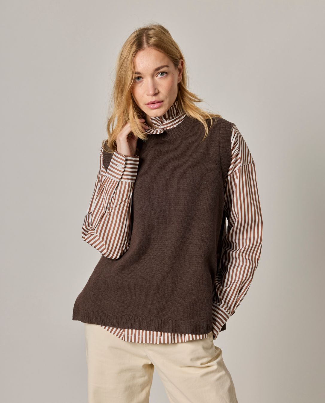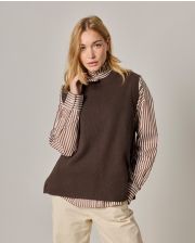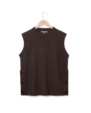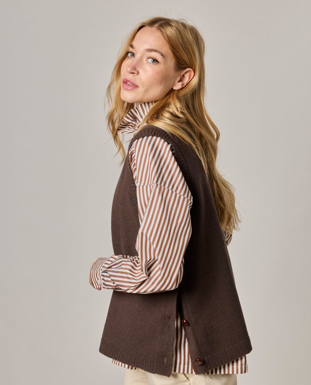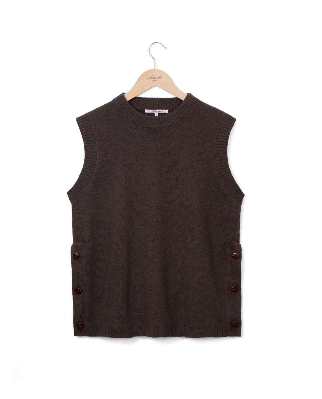 Pull col rond sans manches. Ouvertures boutonnées sur les côtés. Pure laine d'agneau. Taille unique. Longueur totale 62cm. Le mannequin mesure 1,73m et porte une taille unique.