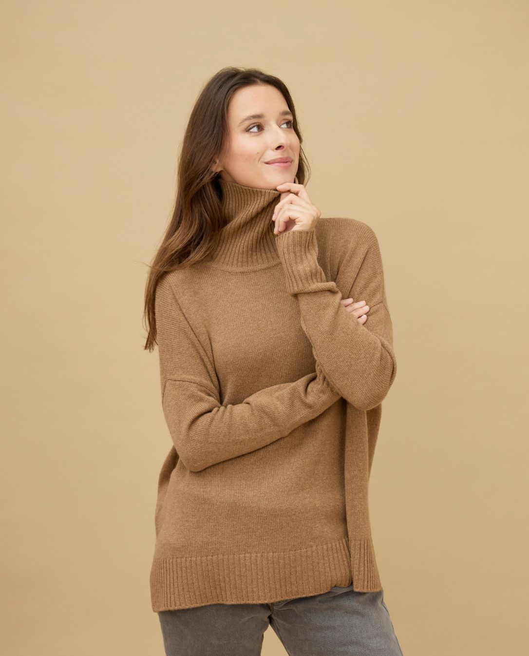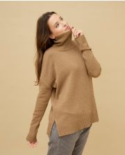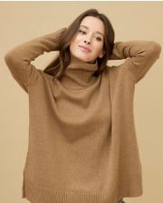 Pull col roulé ample en cachemire double fil. Manches longues, épaules tombantes. Deux fentes de chaque côté au bas de pull. Finition bord-côtes. Taille unique. 100% cachemire.