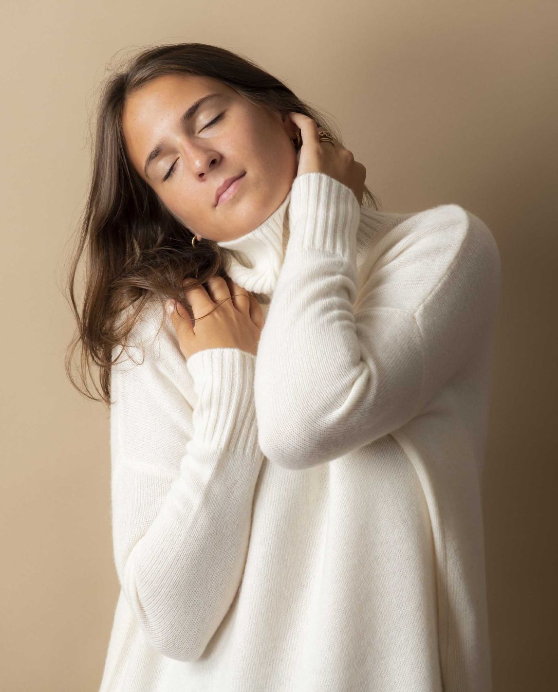 Pull col roulé ample en cachemire double fil. Manches longues, épaules tombantes. Deux fentes de chaque côté au bas de pull. Finition bord-côtes. Taille unique. 100% cachemire.