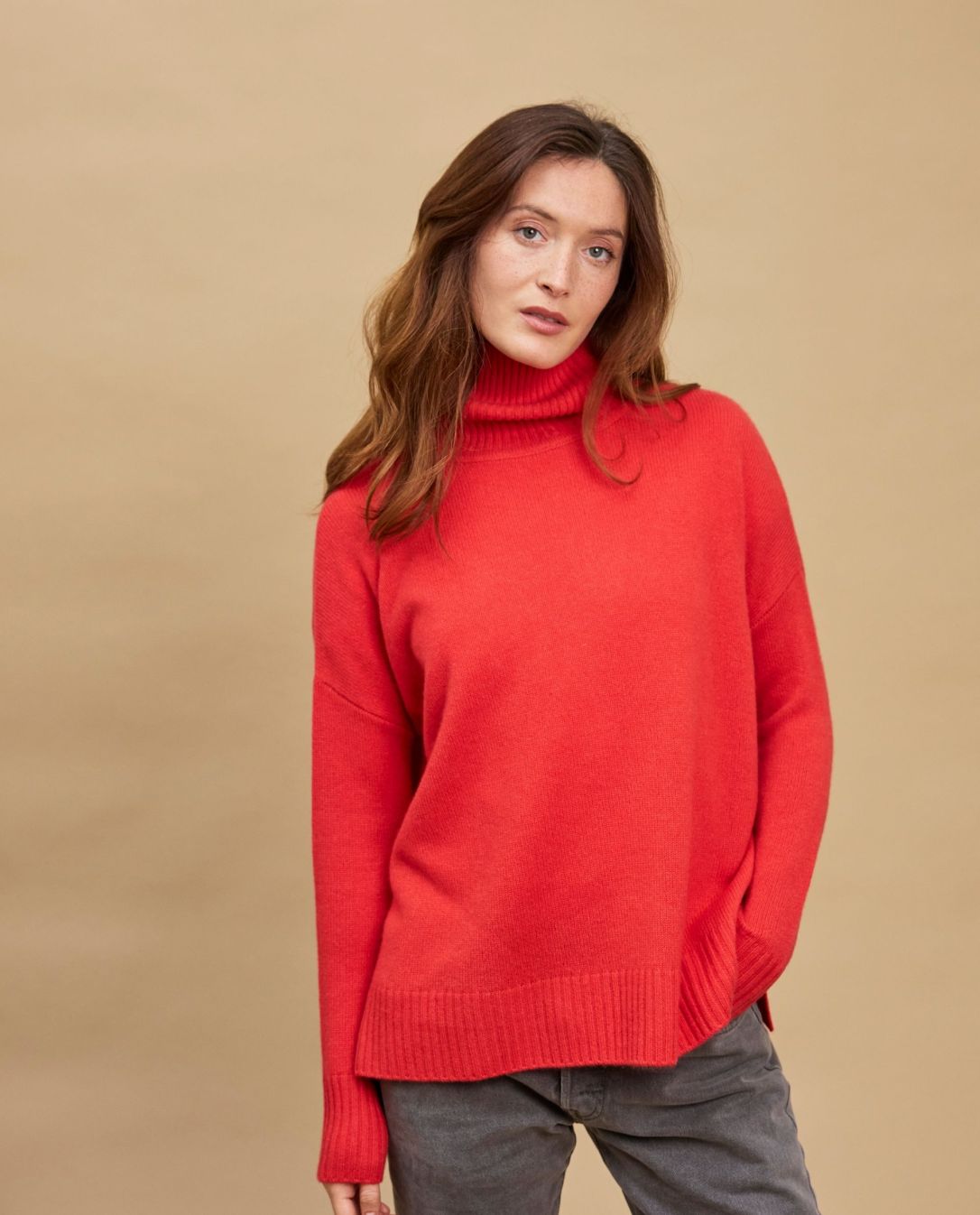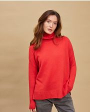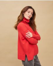 Pull col roulé ample en cachemire double fil. Manches longues, épaules tombantes. Deux fentes de chaque côté au bas de pull. Finition bord-côtes. Taille unique. 100% cachemire.
