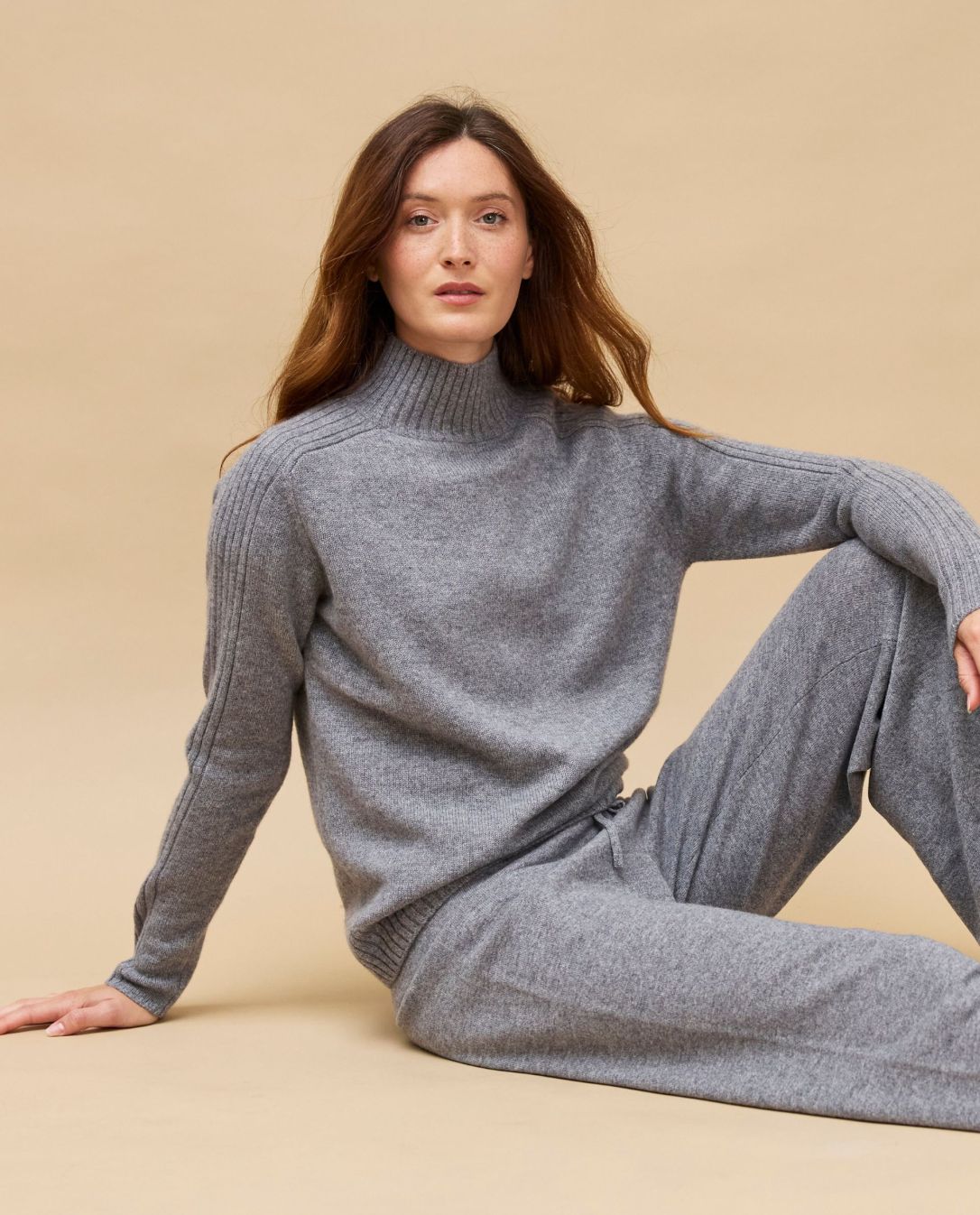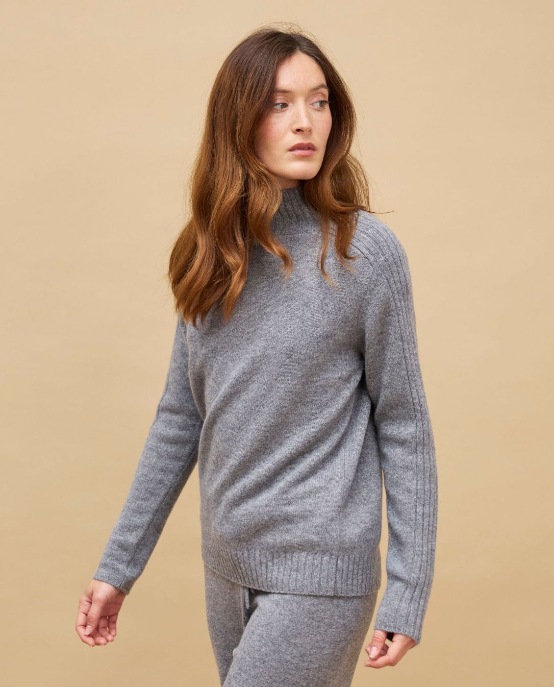 Pull col montant côtes gris moyen 100% cachemire Gris moyen