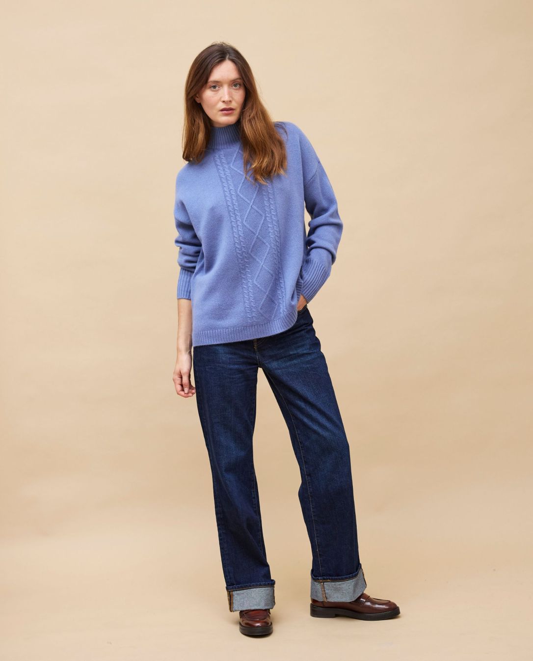 Pull ample col montant en cachemire double fil. Jacquard milieu devant. Deux fentes au bas. 100% cachemire.