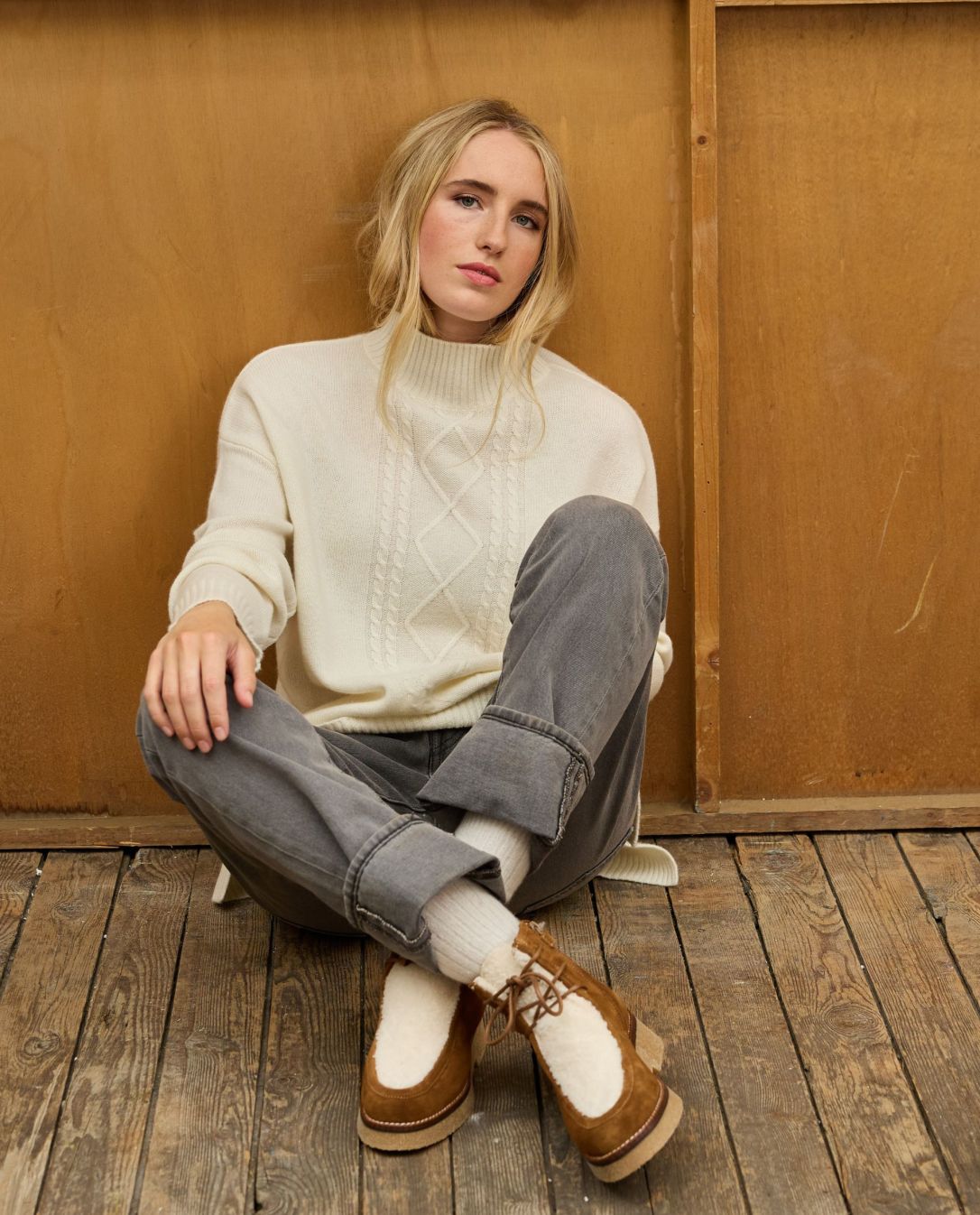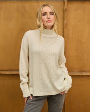 Pull ample col montant en cachemire double fil. Jacquard milieu devant. Deux fentes au bas. Le mannequin mesure 1m72 et porte une taille 1. 100% cachemire.