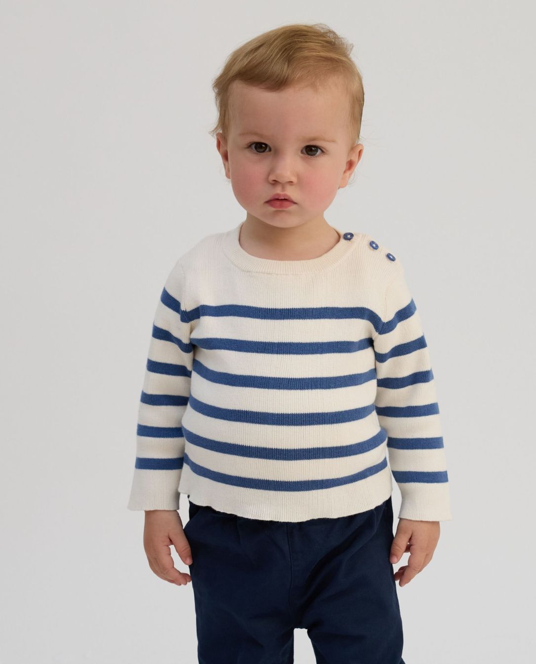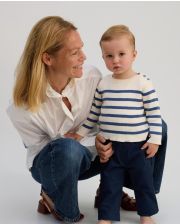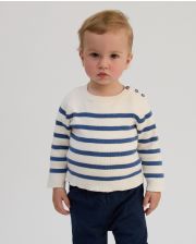 Pull rayé encolure ronde. Ouverture épaule gauche par 3 petits boutons. Maille en côtes. 100% coton.