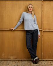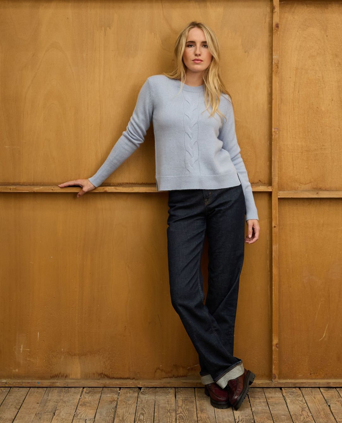 Pull court encolure ronde en cachemire double fil. Grosse torsade milieu devant. Finition bord-côtes. Deux fentes côtés. Le mannequin mesure 1m72 et porte une taille 1. 100% cachemire.