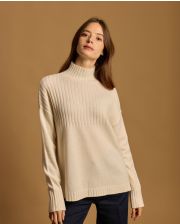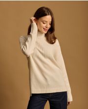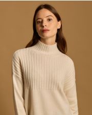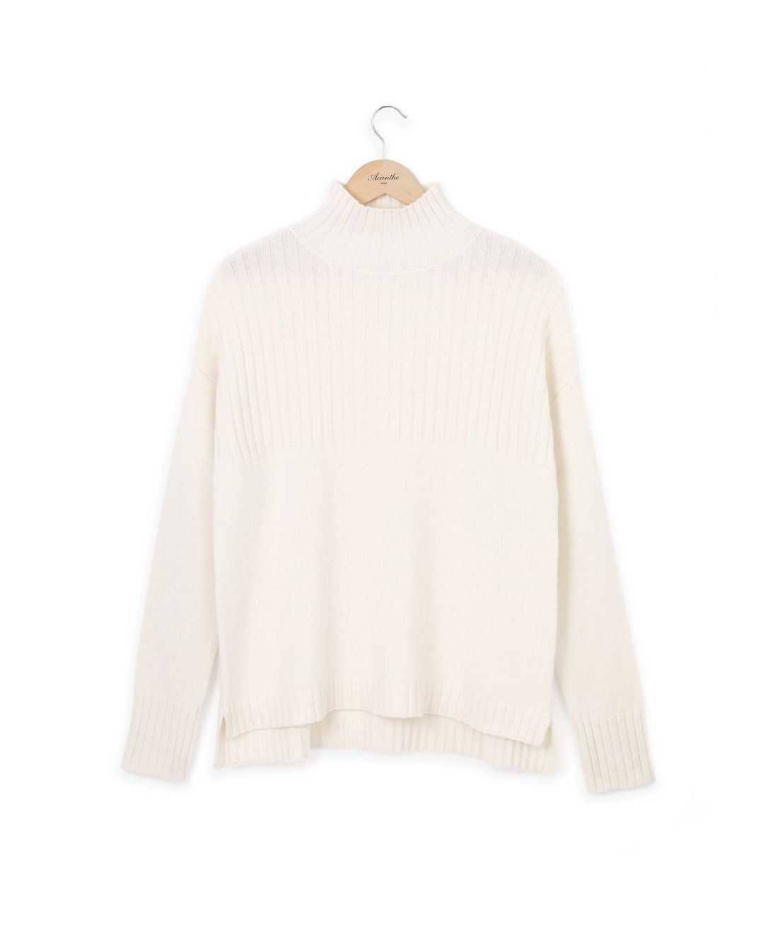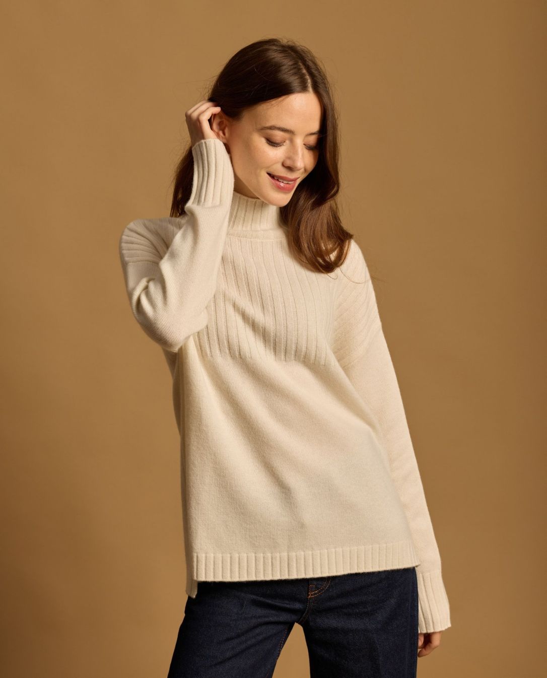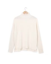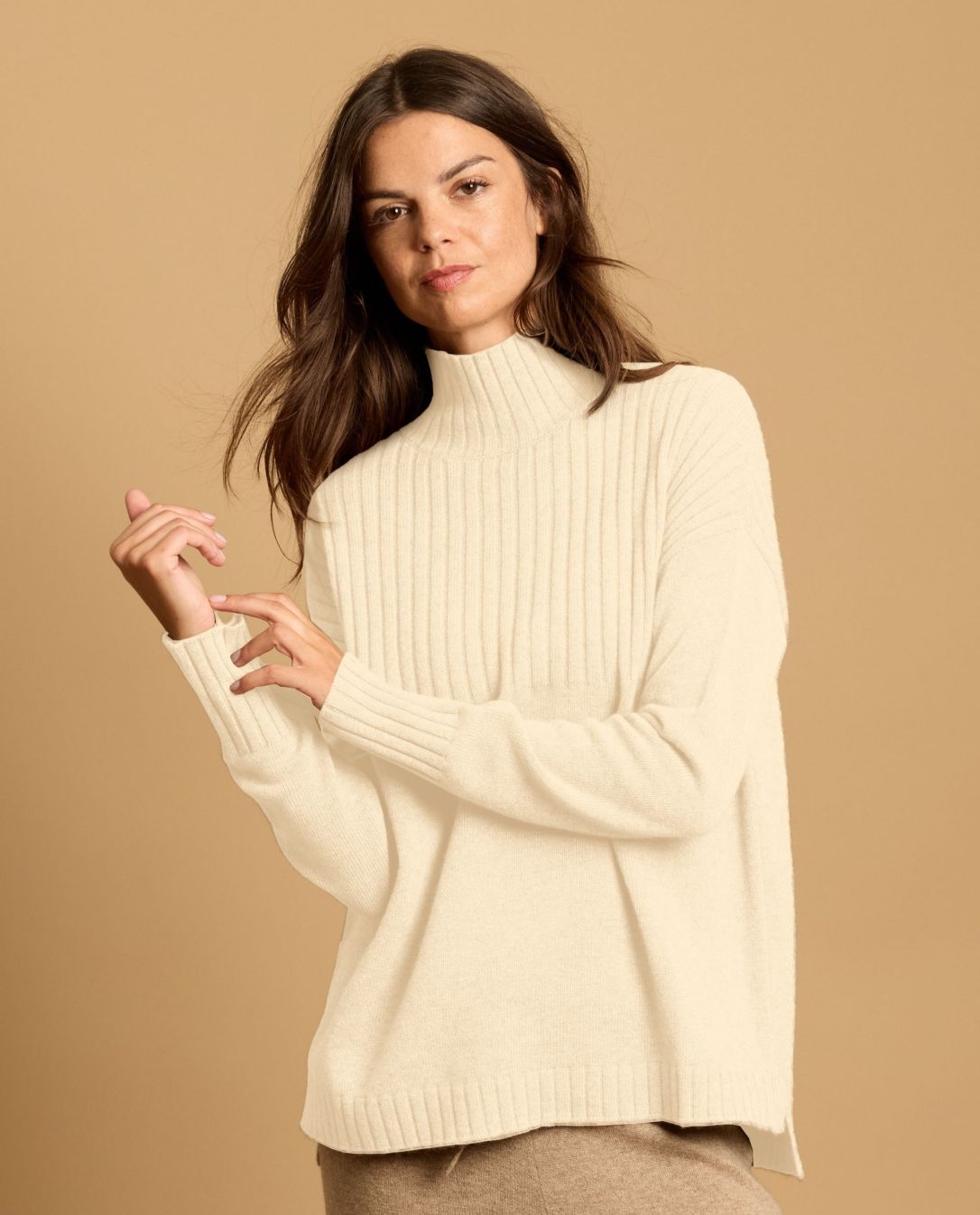 Large pull col montant en cachemire double fil. Côtes plates au col et aux épaules. Taille unique. Longueur épaule dos 67 cm. Le mannequin mesure 1,80m.