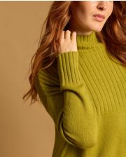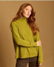 Large pull col montant en cachemire double fil. Côtes plates au col et aux épaules. Taille unique. Longueur épaule dos 67 cm. Le mannequin mesure 1,80m.