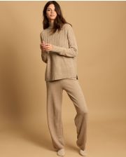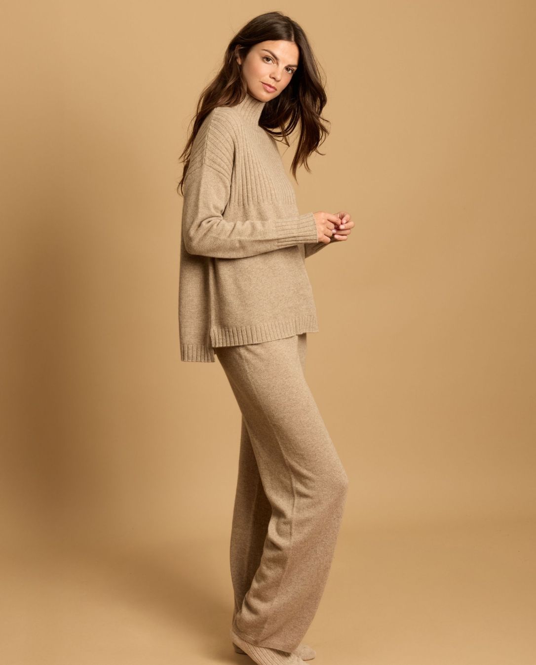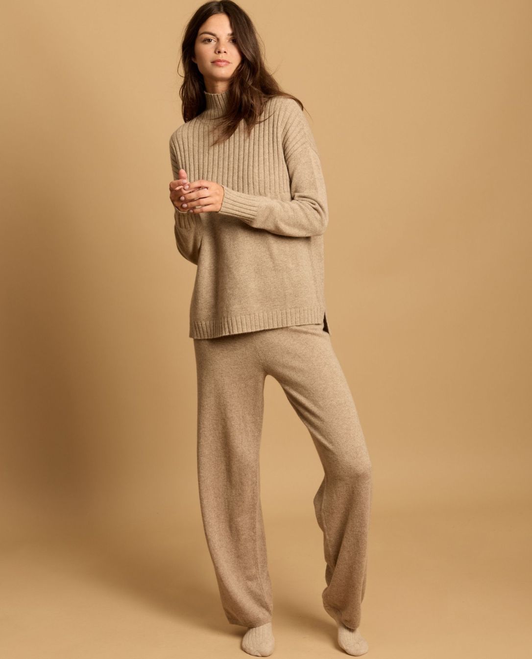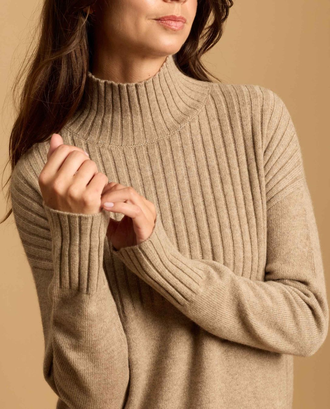 Large pull col montant en cachemire double fil. Côtes plates au col et aux épaules. Taille unique. Longueur épaule dos 67 cm. Le mannequin mesure 1,80m.