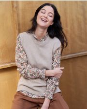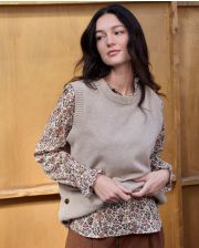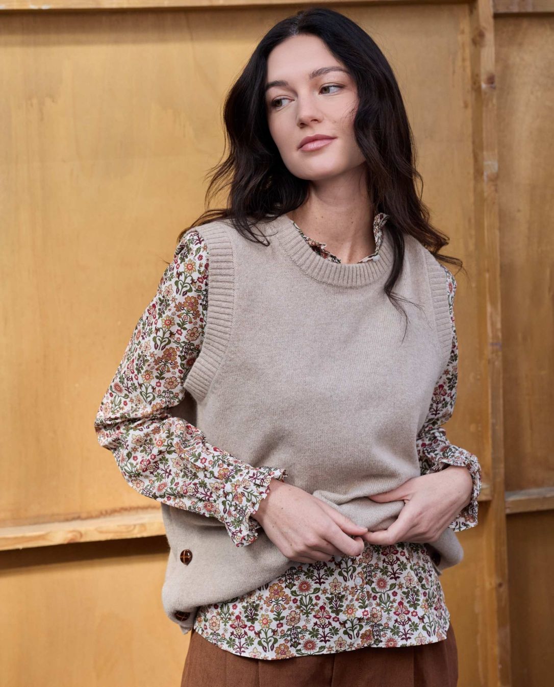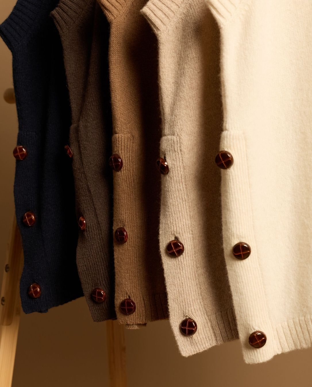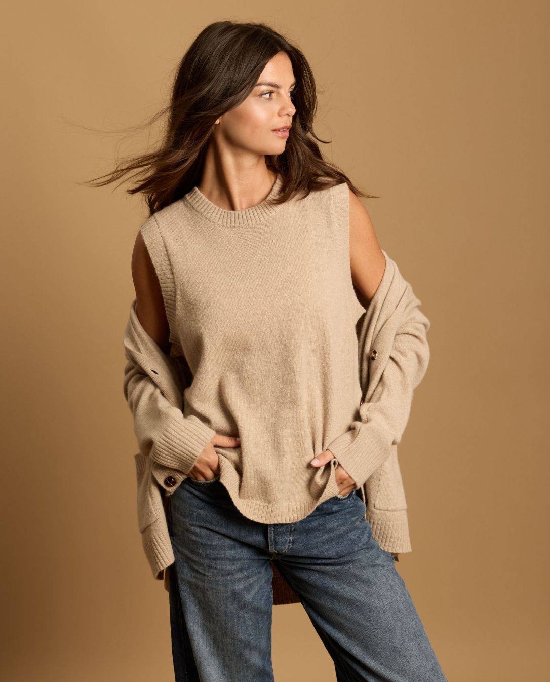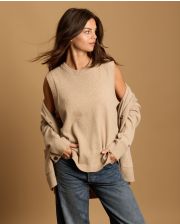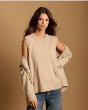 Pull col rond sans manches, avec ouvertures boutonnées sur les côtés. Pure laine d'agneau. Taille unique. Longueur épaule 62 cm. Le mannequin mesure 1,75m.