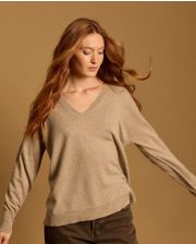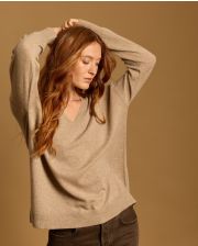 Pull loose encolure V en cachemire double fil. Taille unique. Deux fentes côté. Finition bord côtes. Taille unique. Longueur épaule 65 cm. Le mannequin mesure 1,80m.