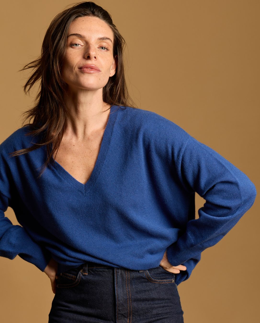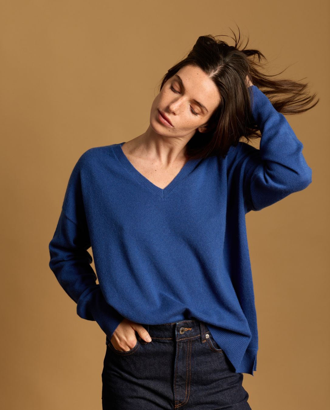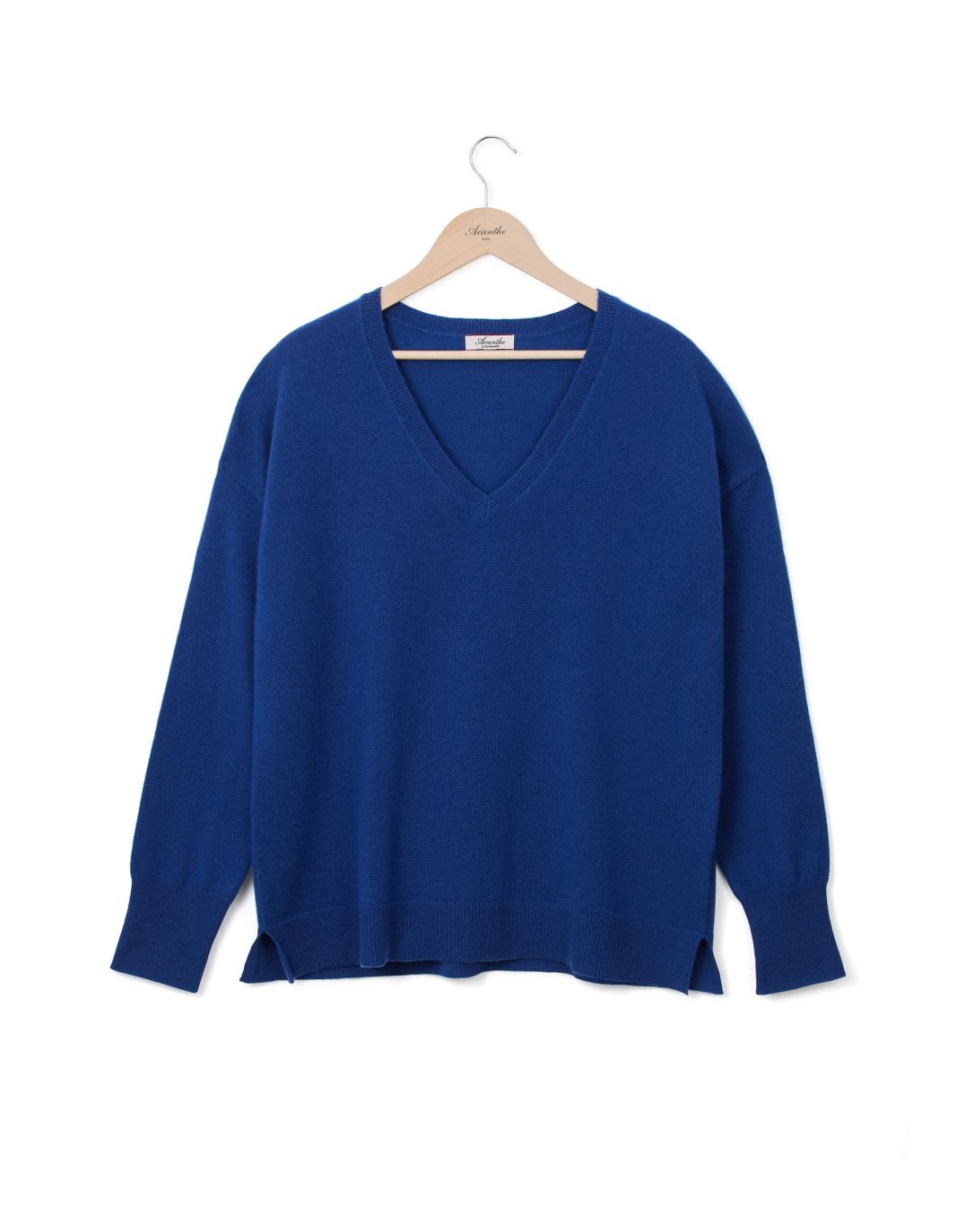 Pull loose encolure V en cachemire double fil. Taille unique. Deux fentes côté. Finition bord côtes. Taille unique. Longueur épaule 65 cm. Le mannequin mesure 1,80m.