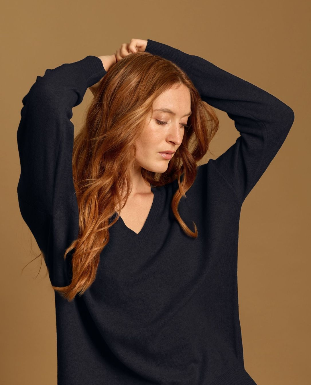 Pull loose encolure V en cachemire double fil. Taille unique. Deux fentes côté. Finition bord côtes. Taille unique.