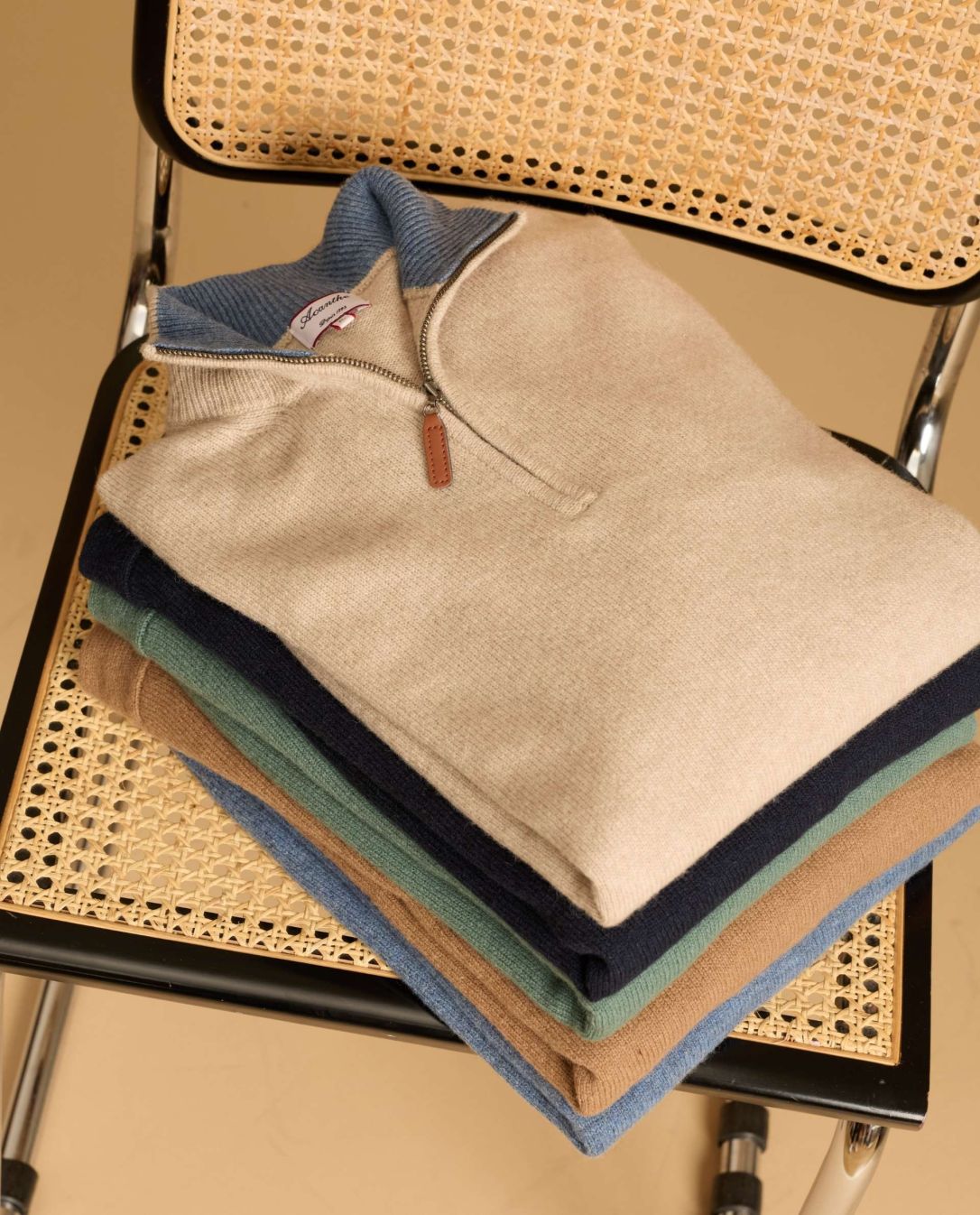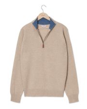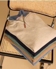 Pull col zippé avec intérieur contrasté. Finition bord côtes. Pure laine d'agneau.