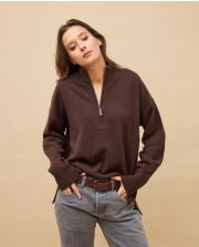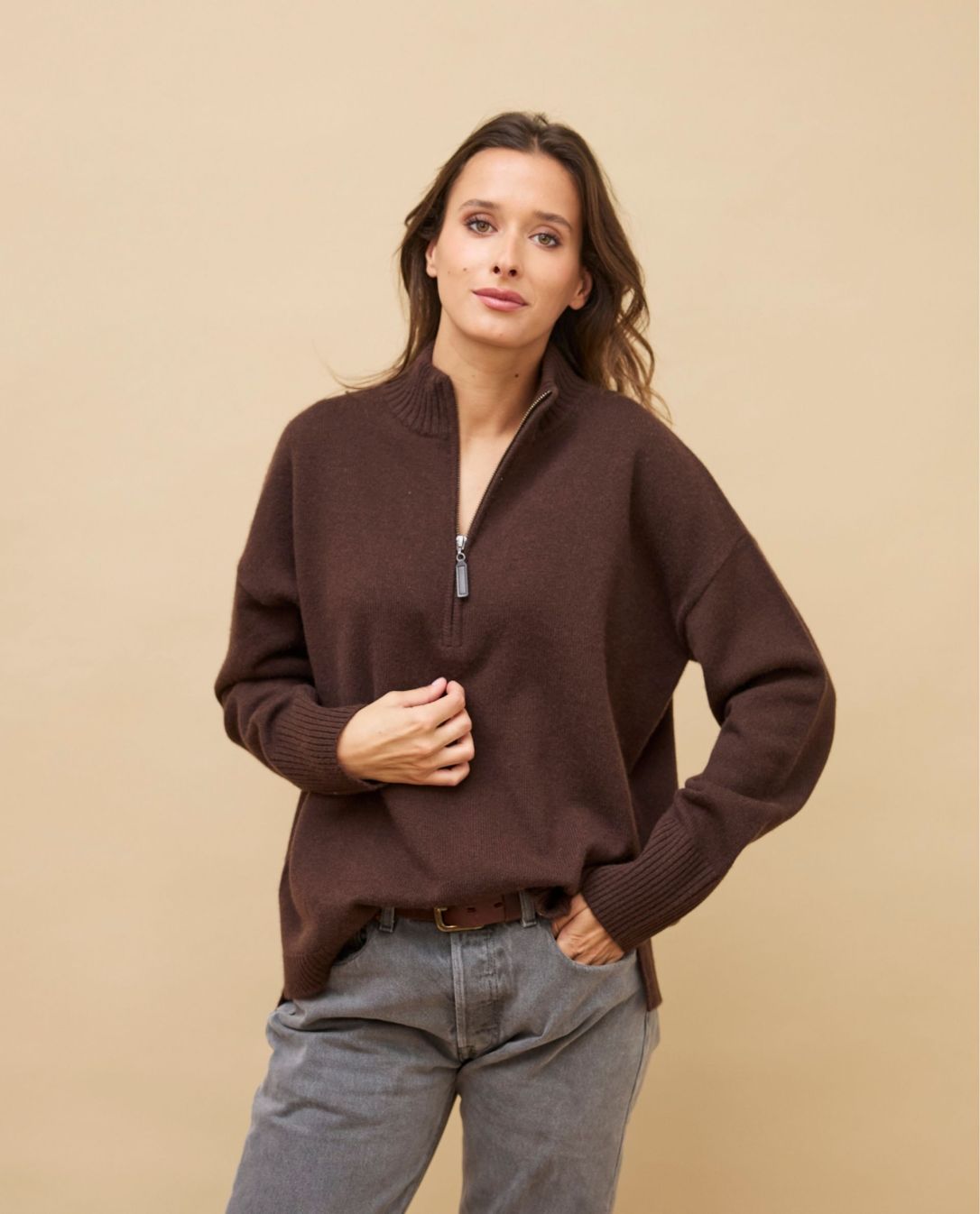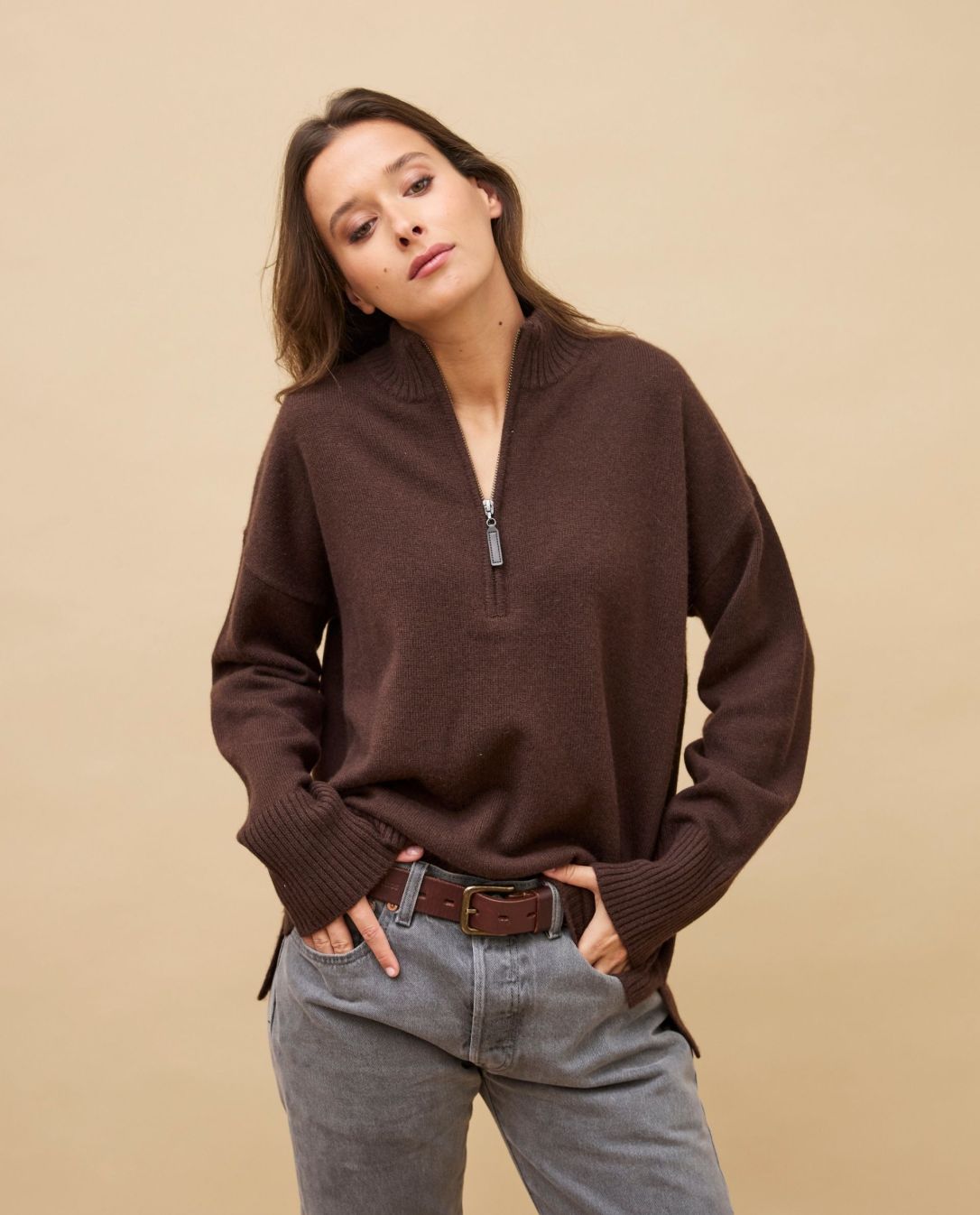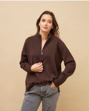 Pull loose col zippé en cachemire double fil. Deux fentes côté. Finition bord-côtes. Taille unique. Longueur 67 cm. 100% cachemire.