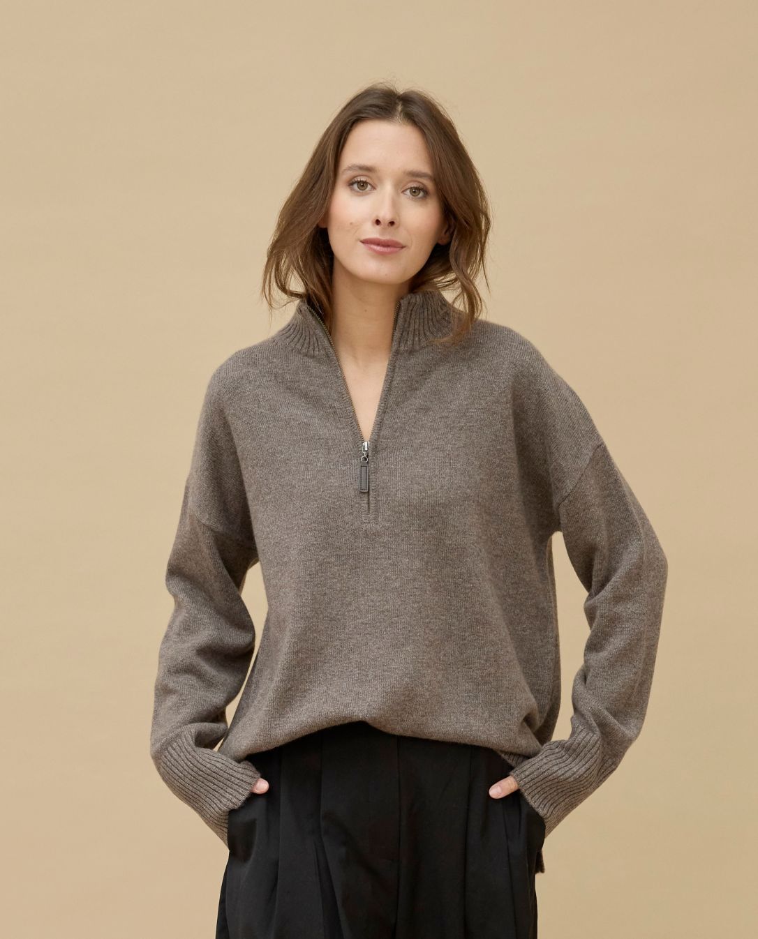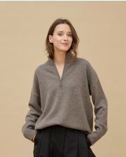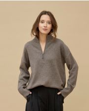 Pull loose col zippé en cachemire double fil. Deux fentes côté. Finition bord-côtes. Taille unique. Longueur 67 cm. 100% cachemire.