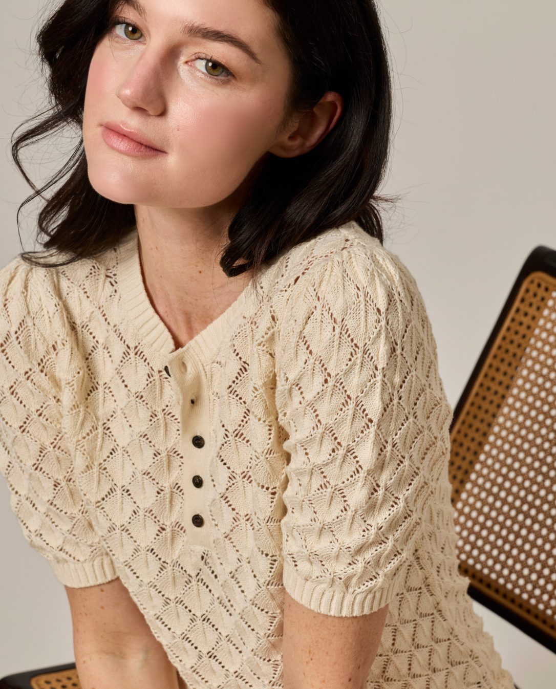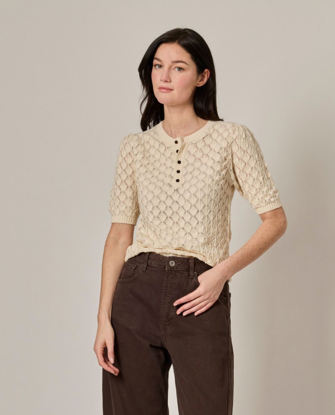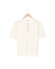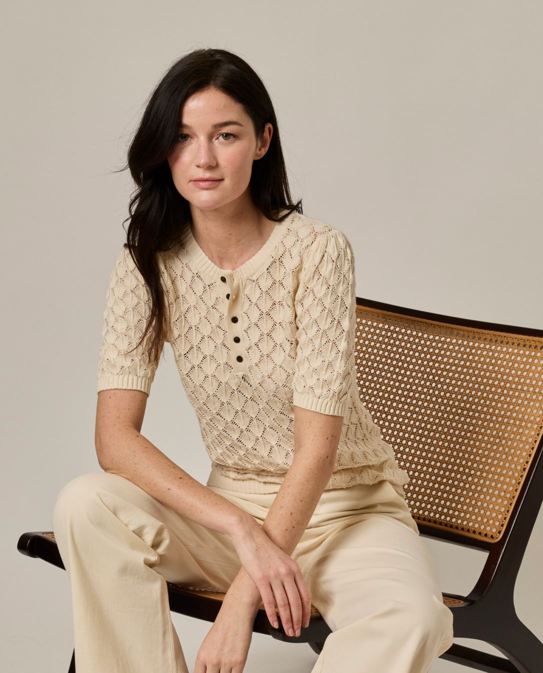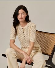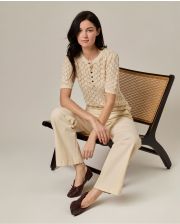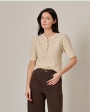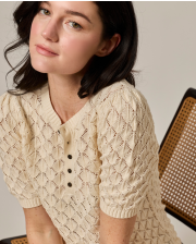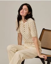 Pull col rond en crochet. Manches courtes. Pate de boutonnage 5 boutons au devant. Col et bas de pull en côtes. Longueur totale 58 cm toutes tailles. Le mannequin mesure 1,77m et porte une taille 1.
