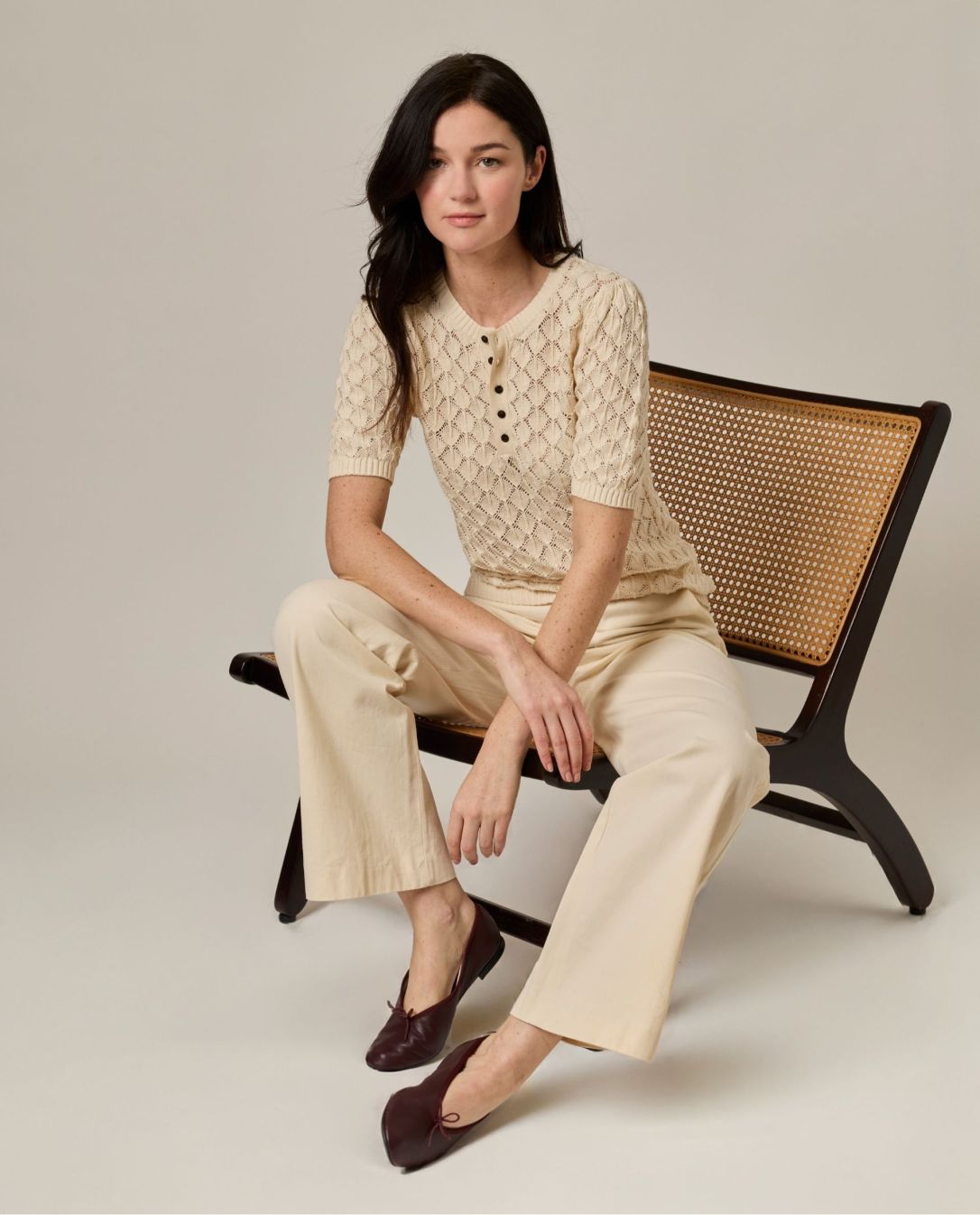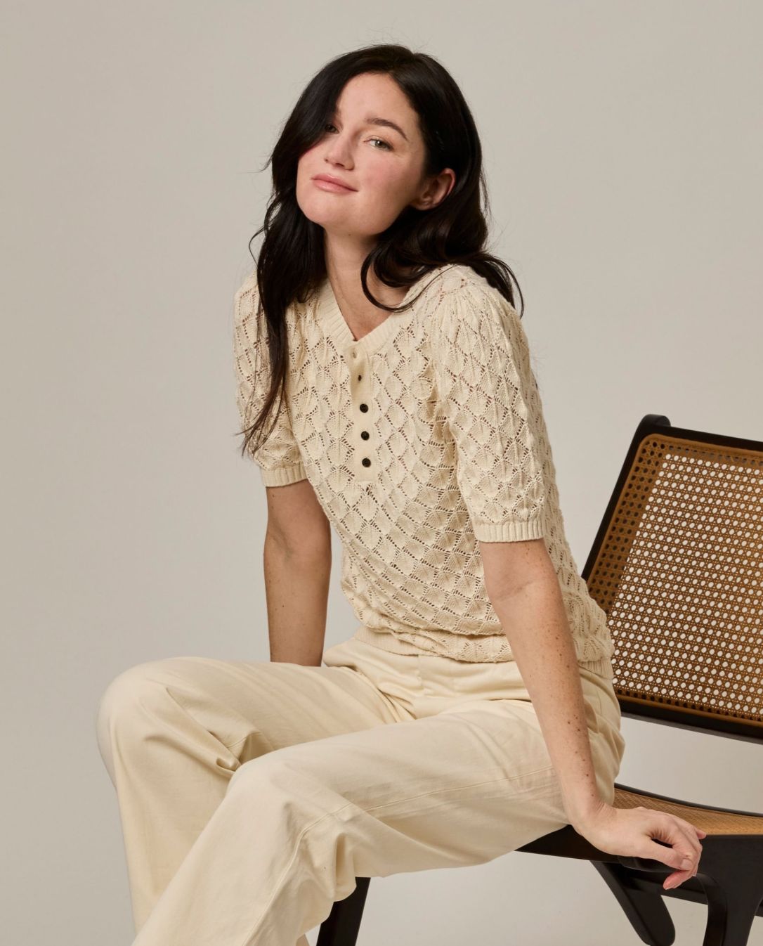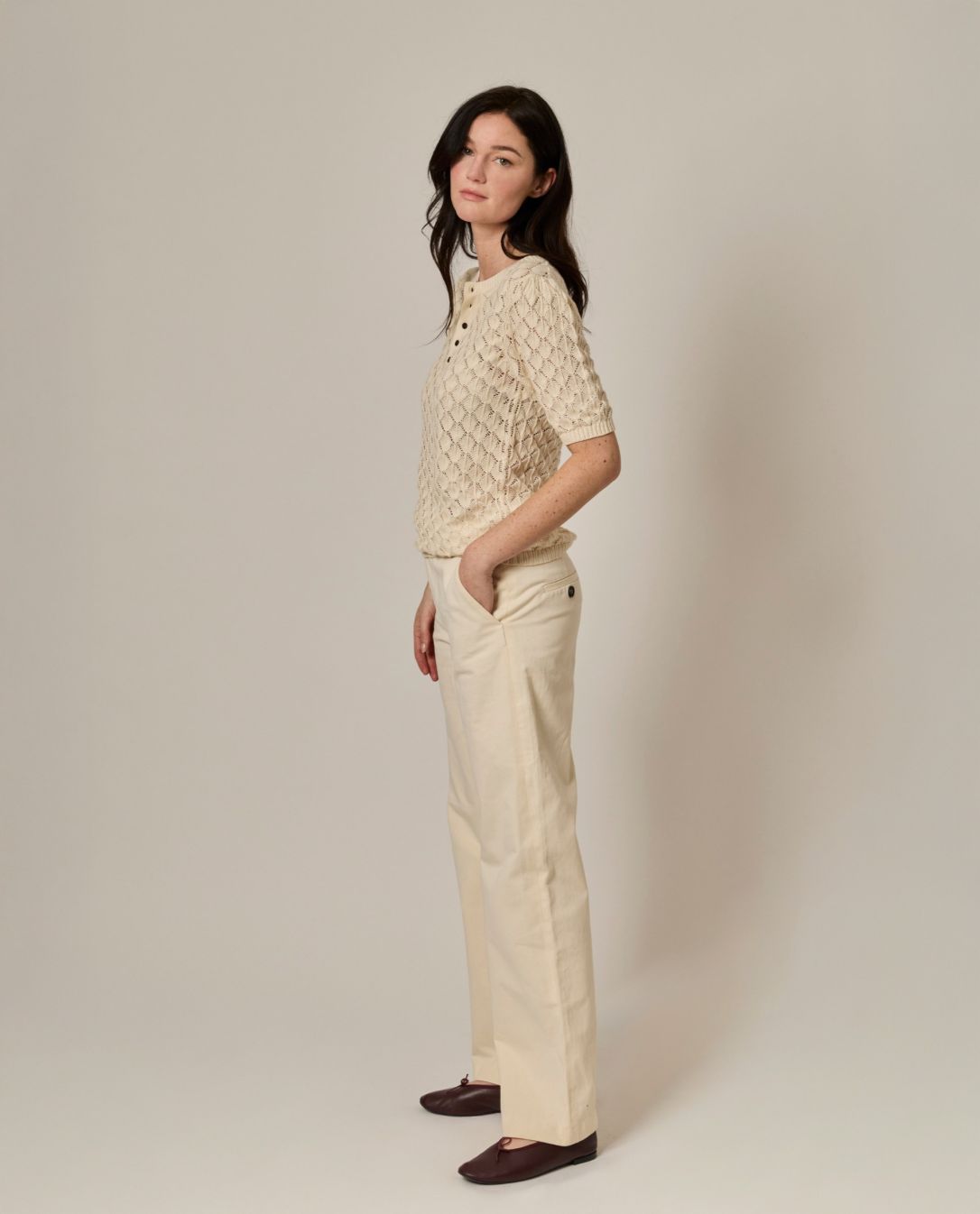 Pull col rond en crochet. Manches courtes. Pate de boutonnage 5 boutons au devant. Col et bas de pull en côtes. Longueur totale 58 cm toutes tailles. Le mannequin mesure 1,77m et porte une taille 1.