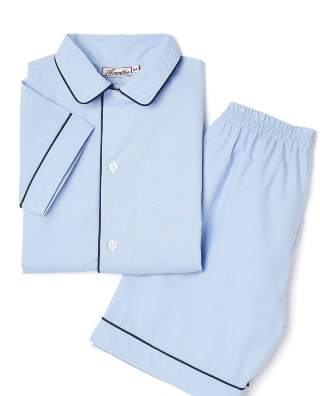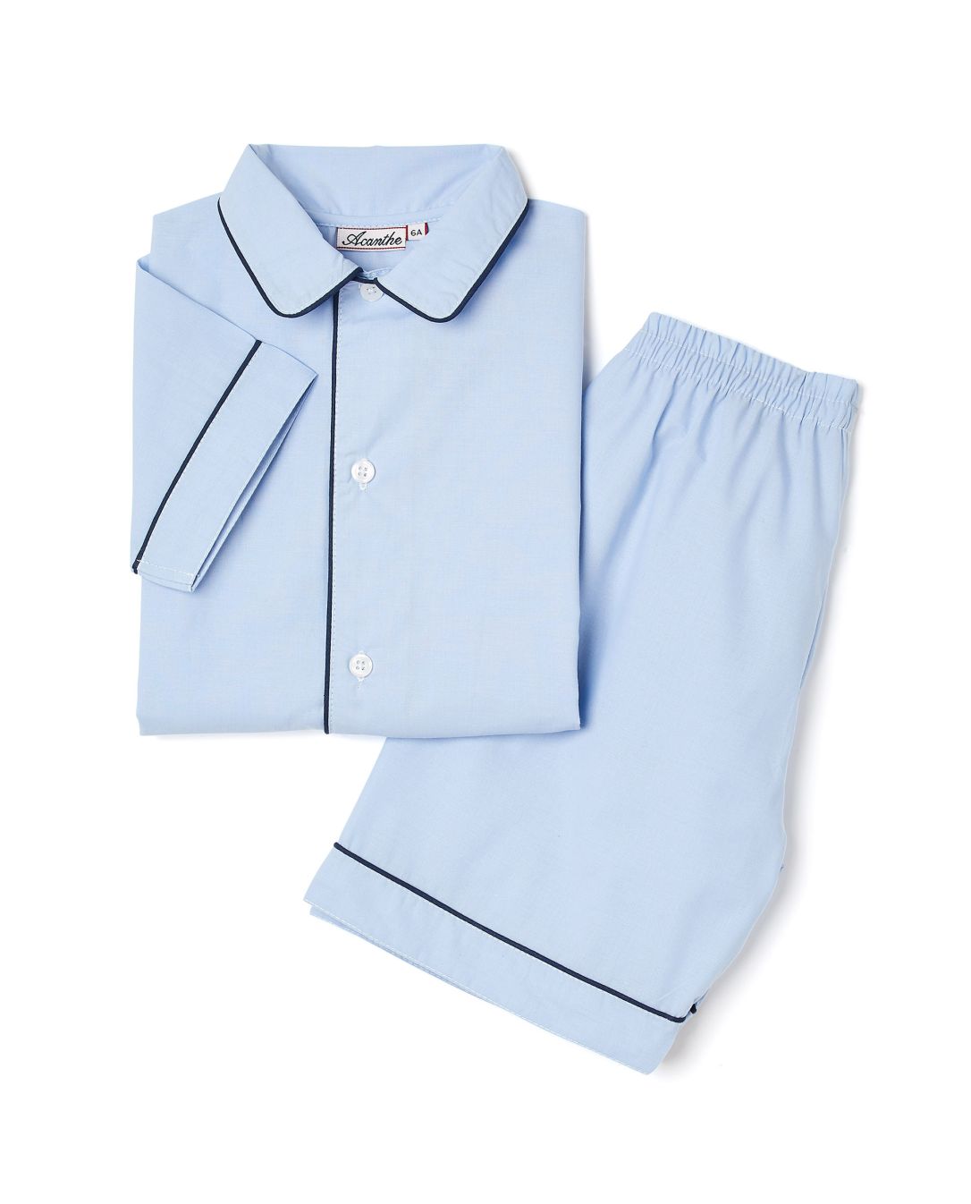Pyjama garçon classique. Veste boutonnée devant, col pointu, manches courtes et 2 poches plaquées. Short à taille élastiquée. Finitions passepoil.