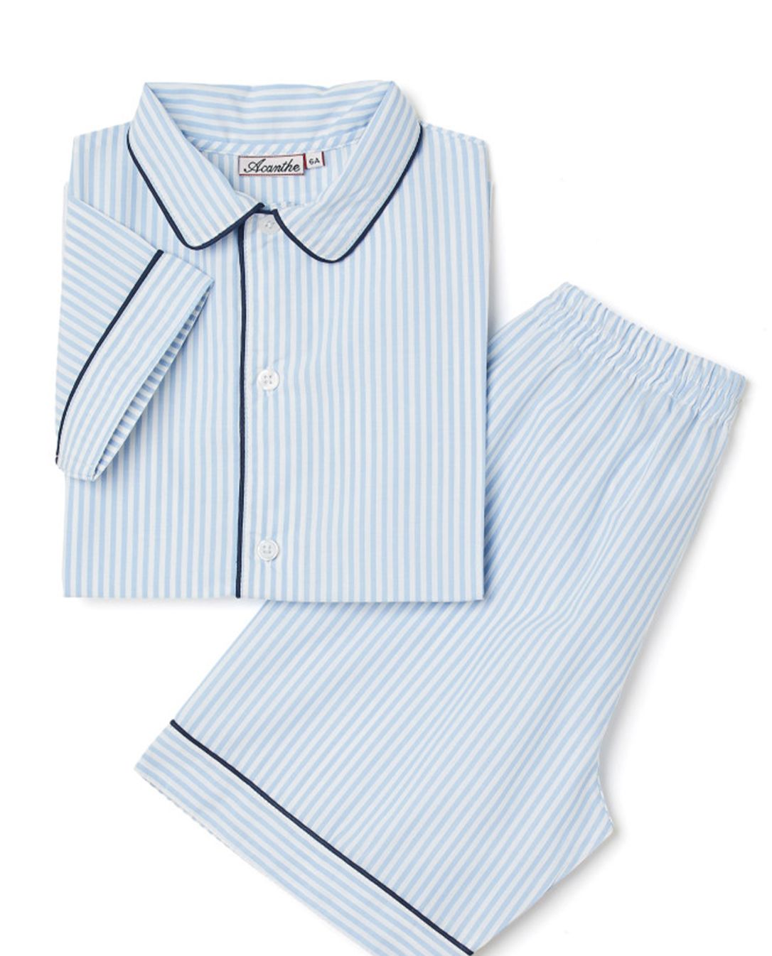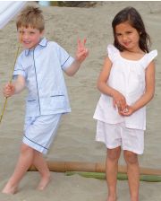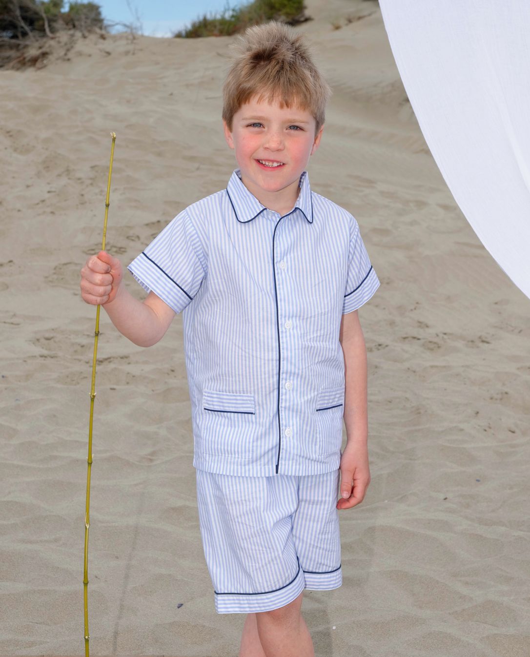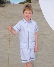 Pyjama garçon classique. Veste boutonnée devant, col pointu, manches courtes et 2 poches plaquées. Short à taille élastiquée. Finitions passepoil.