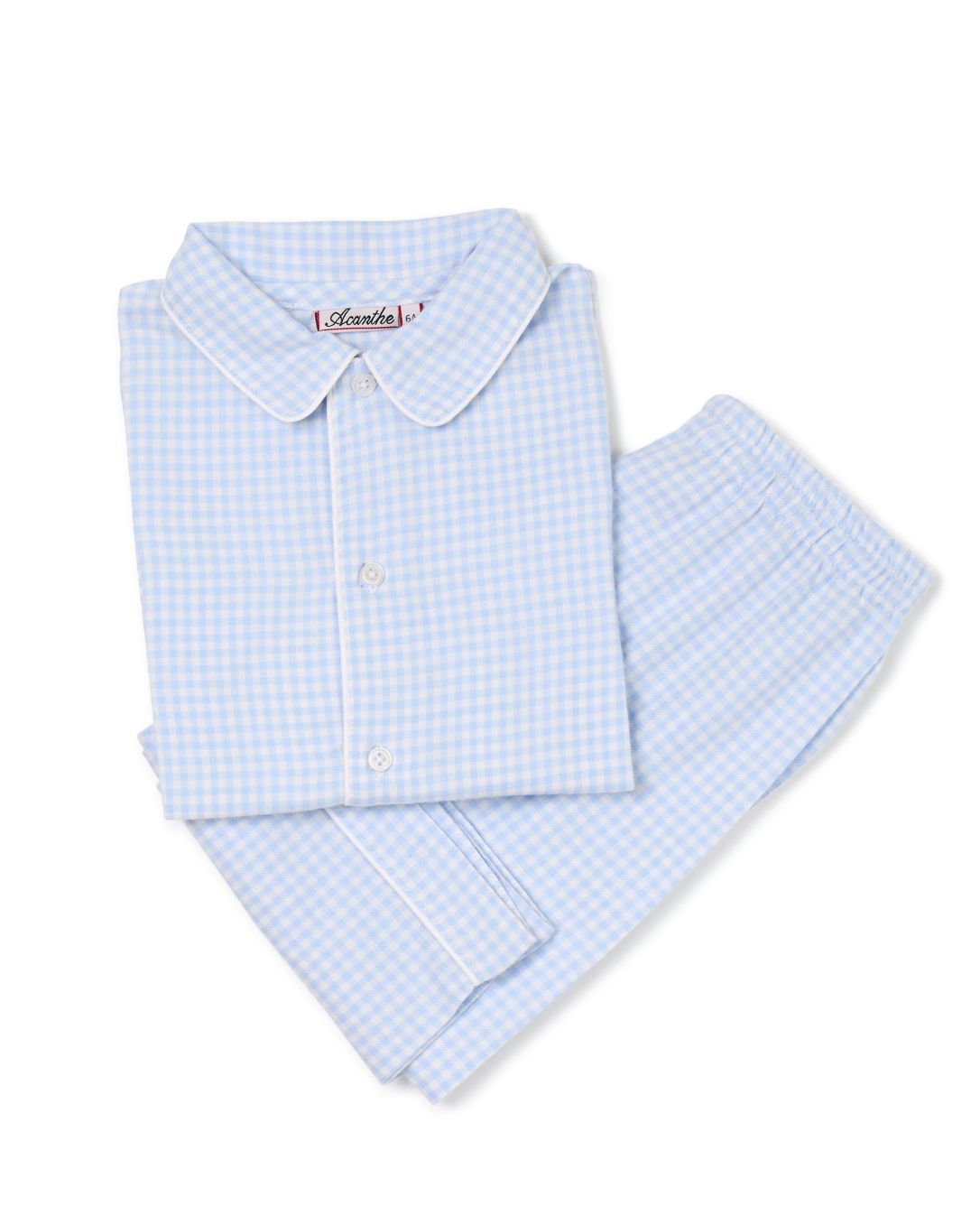 Pyjama garçon classique. Veste boutonnée devant, col pointu, manches longues et 2 poches plaquées. Pantalon à taille élastiquée. Finitions passepoil. 100% coton.