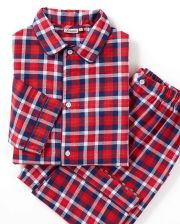 Pyjama garçon classique. Veste boutonnée devant, col pointu, manches longues et 2 poches plaquées. Pantalon à taille élastiquée. Finitions passepoil.