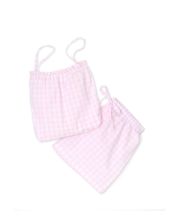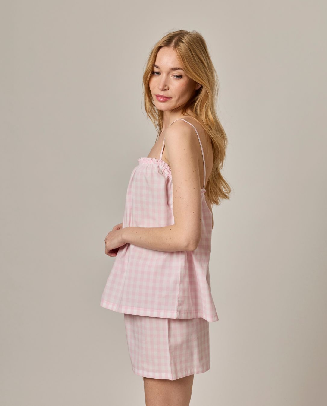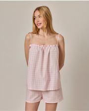 Pyjama d'été. Ensemble short et haut à fines bretelles. Short élastiqué avec lien au devant. Haut élastiqué. Le mannequin mesure 1,73m et porte une taille 1.