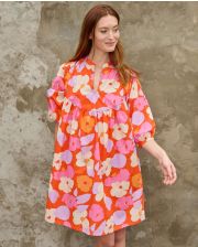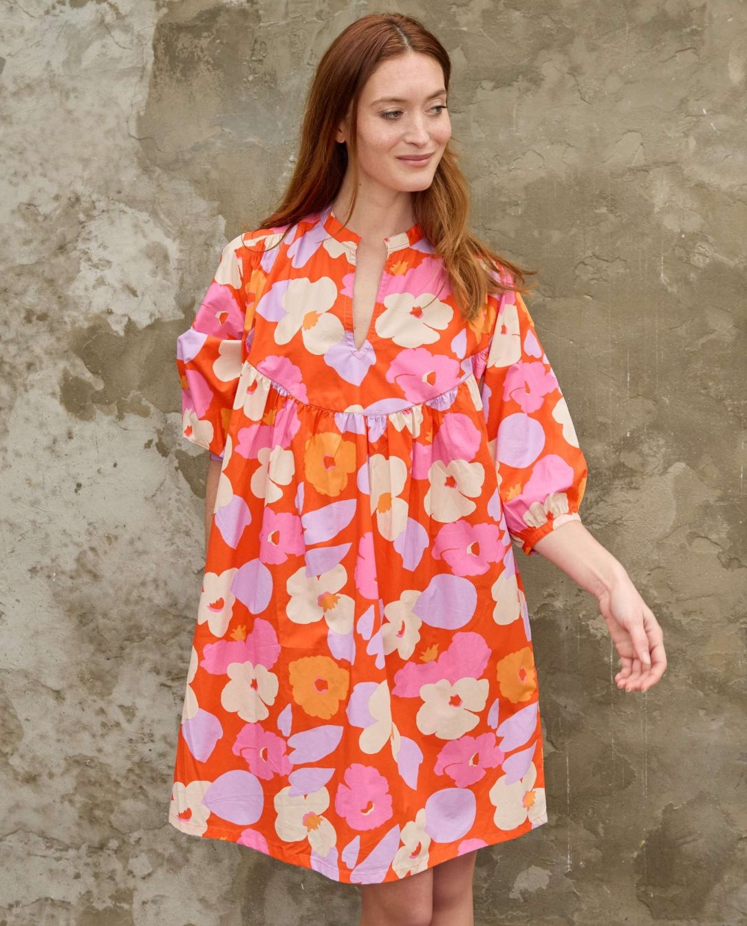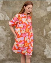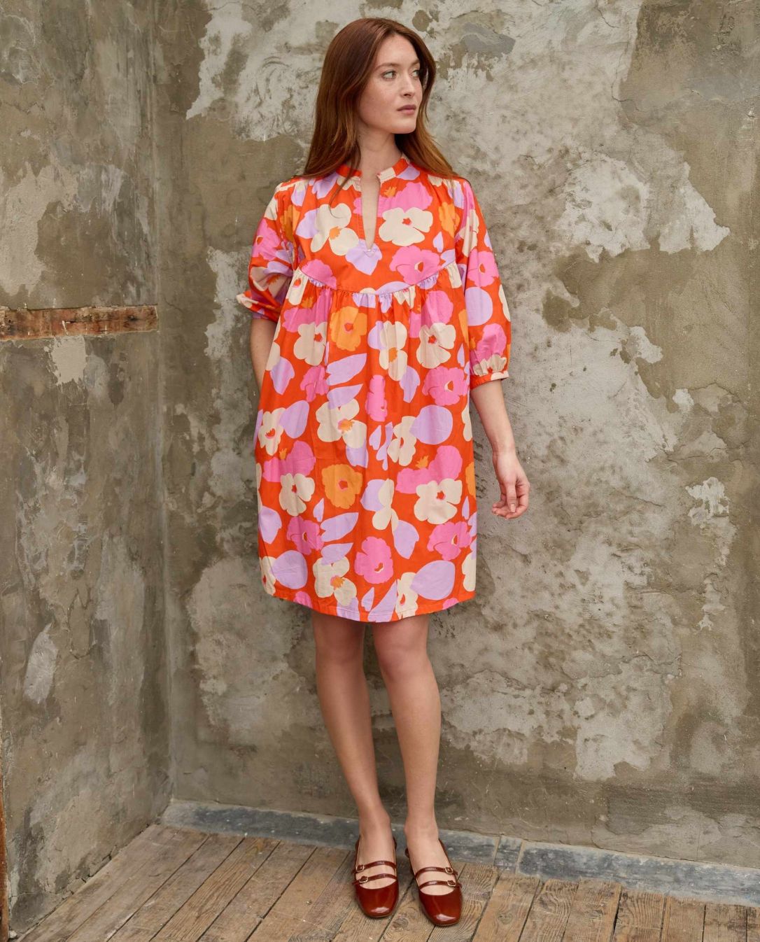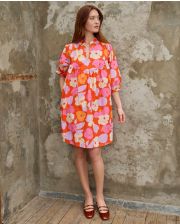 Robe ample, col droit fendu avec manches 7/8 bouffantes. Tissu Liberty popeline lourde Picadilly. 100% coton. Longueur depuis l'épaule pour une taille 1 : 95 cm.Le mannequin mesure 1m75 et porte du T1.
