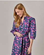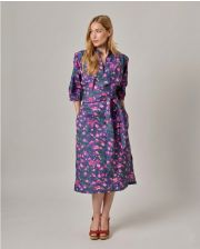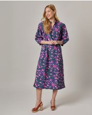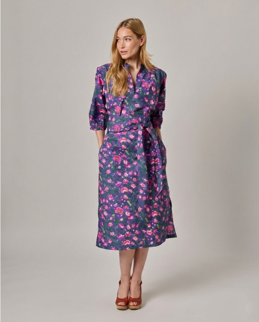 Robe mi-longue col droit. Manches 7/8 bouffantes. Ceinture amovible. Fentes de 25 cm de chaque côté au bas de la robe. Tissu Liberty Columbia Road. Longueur totale 120 cm en taille 1. Le mannequin mesure 1,73m et porte une taille 1.