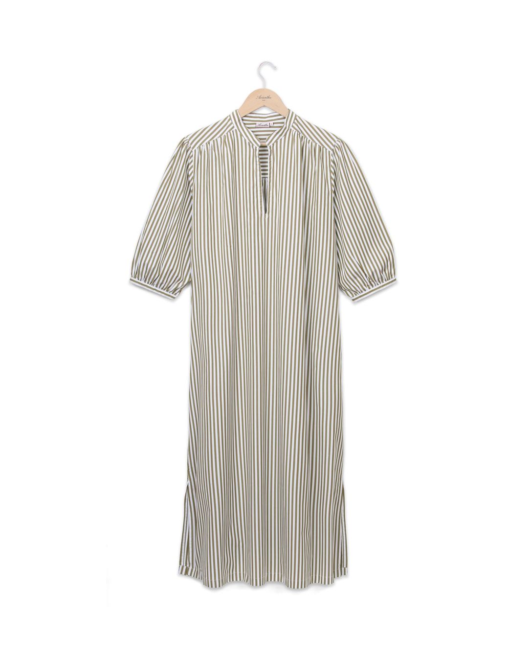 Robe mi-longue col droit. Manches 7/8 bouffantes. Ceinture amovible. Fentes de 25 cm de chaque côté au bas de la robe. Popeline coton. Longueur totale 120 cm en taille 1. Le mannequin mesure 1,73m et porte une taille 1.