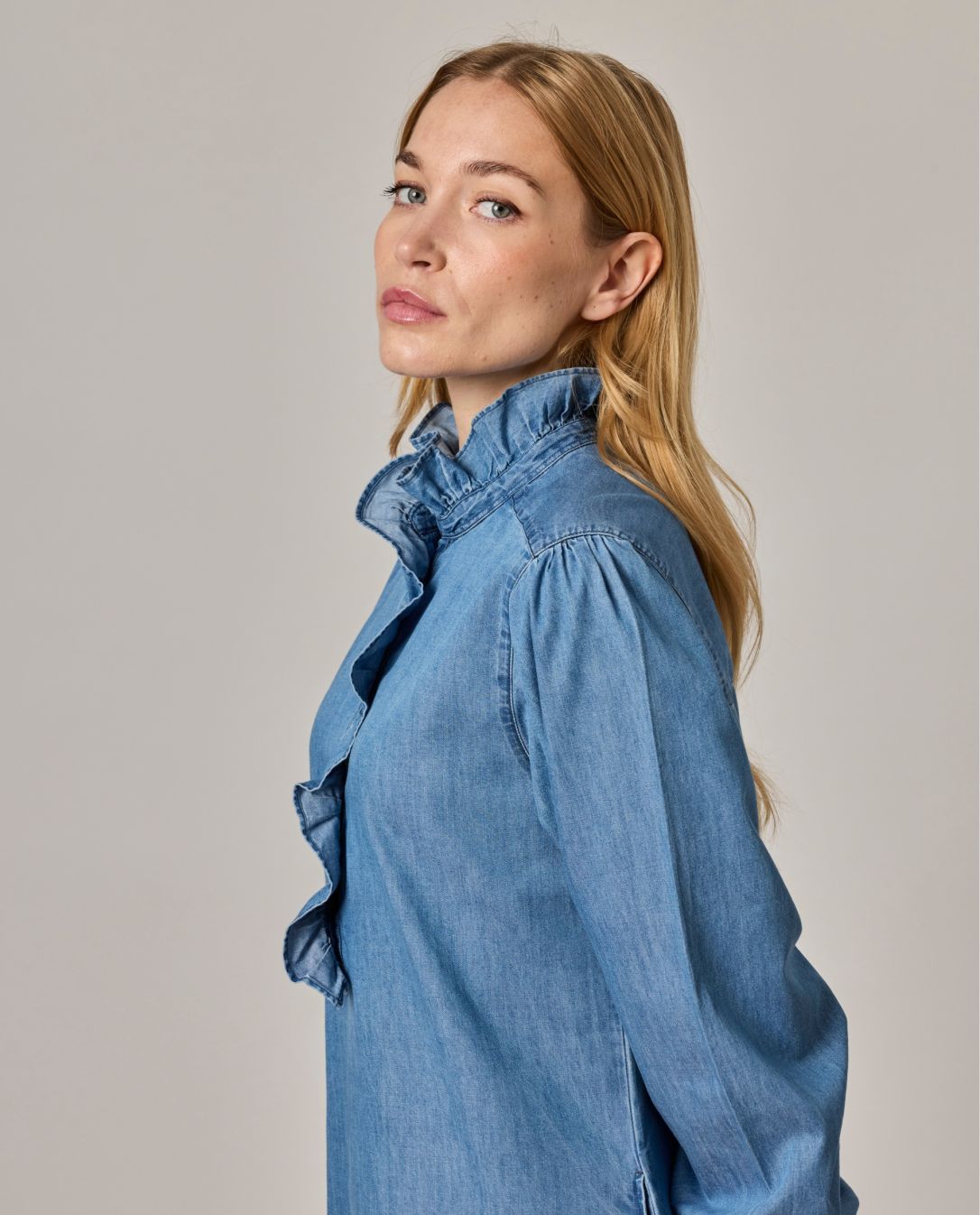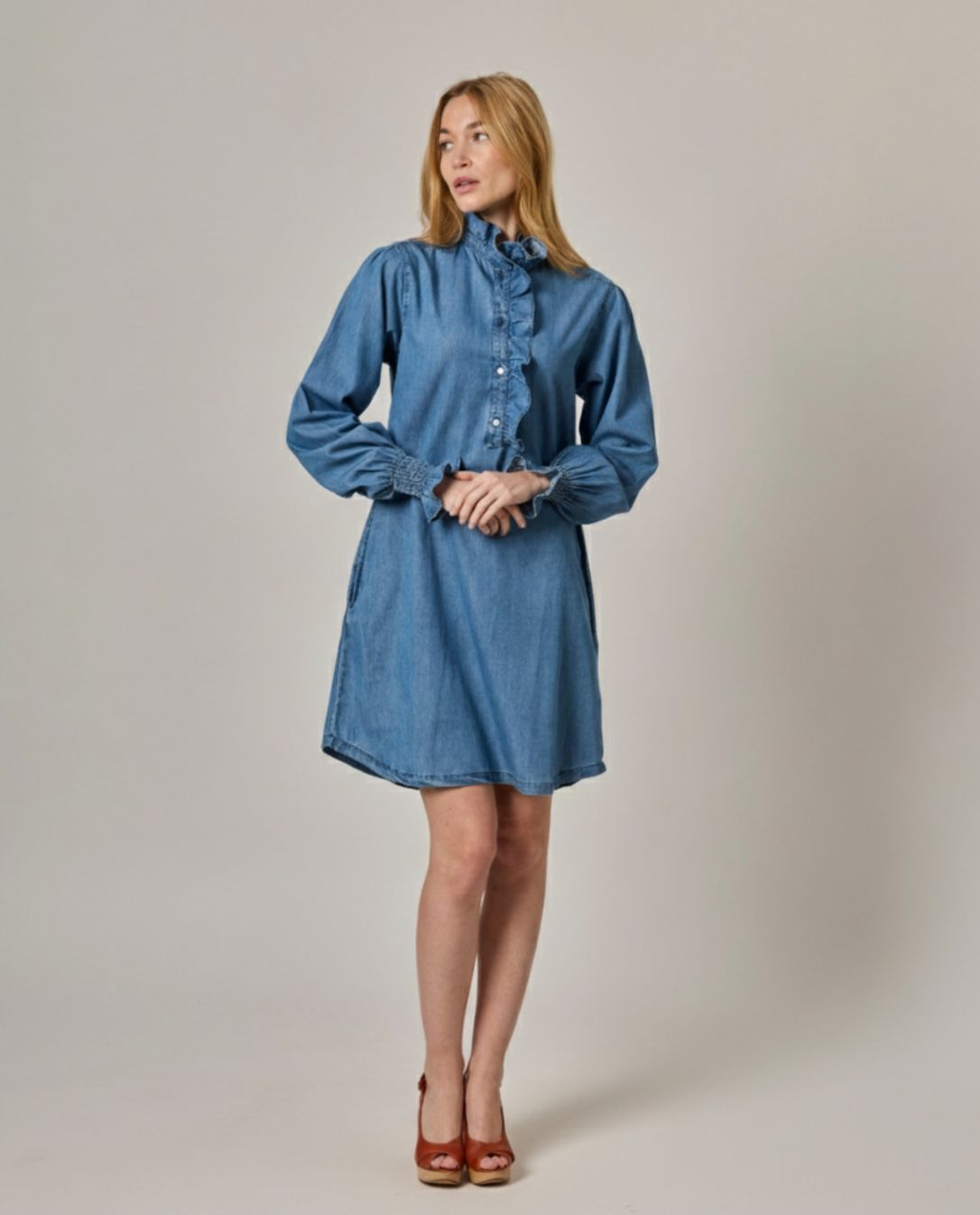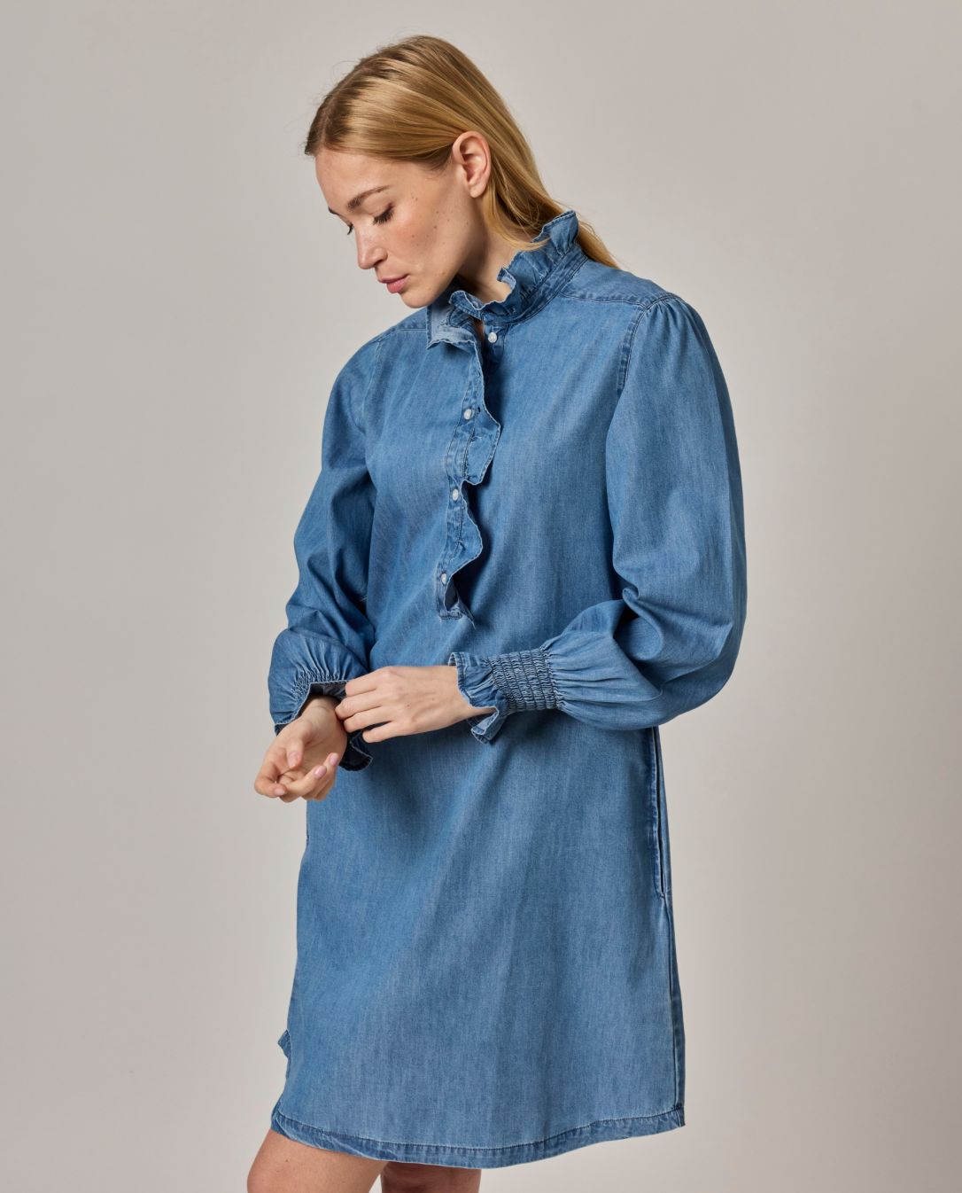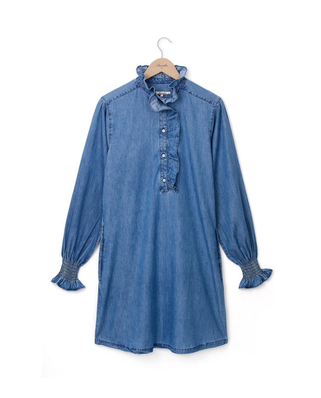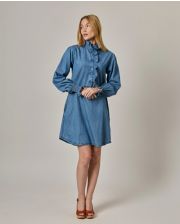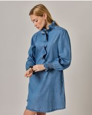 Robe évasée. Petit volant au col et demi patte de boutonnage.Manches longues smockées avec volant. Denim coton. Longueur totale 95 cm en taille 1. Le mannequin mesure 1,73m et porte une taille 1.